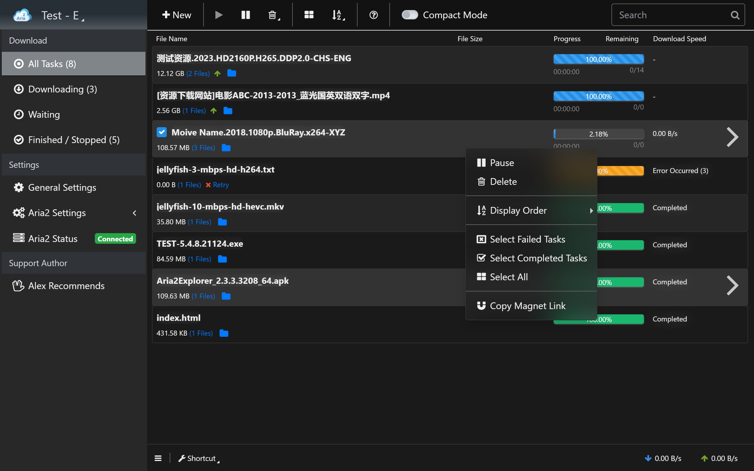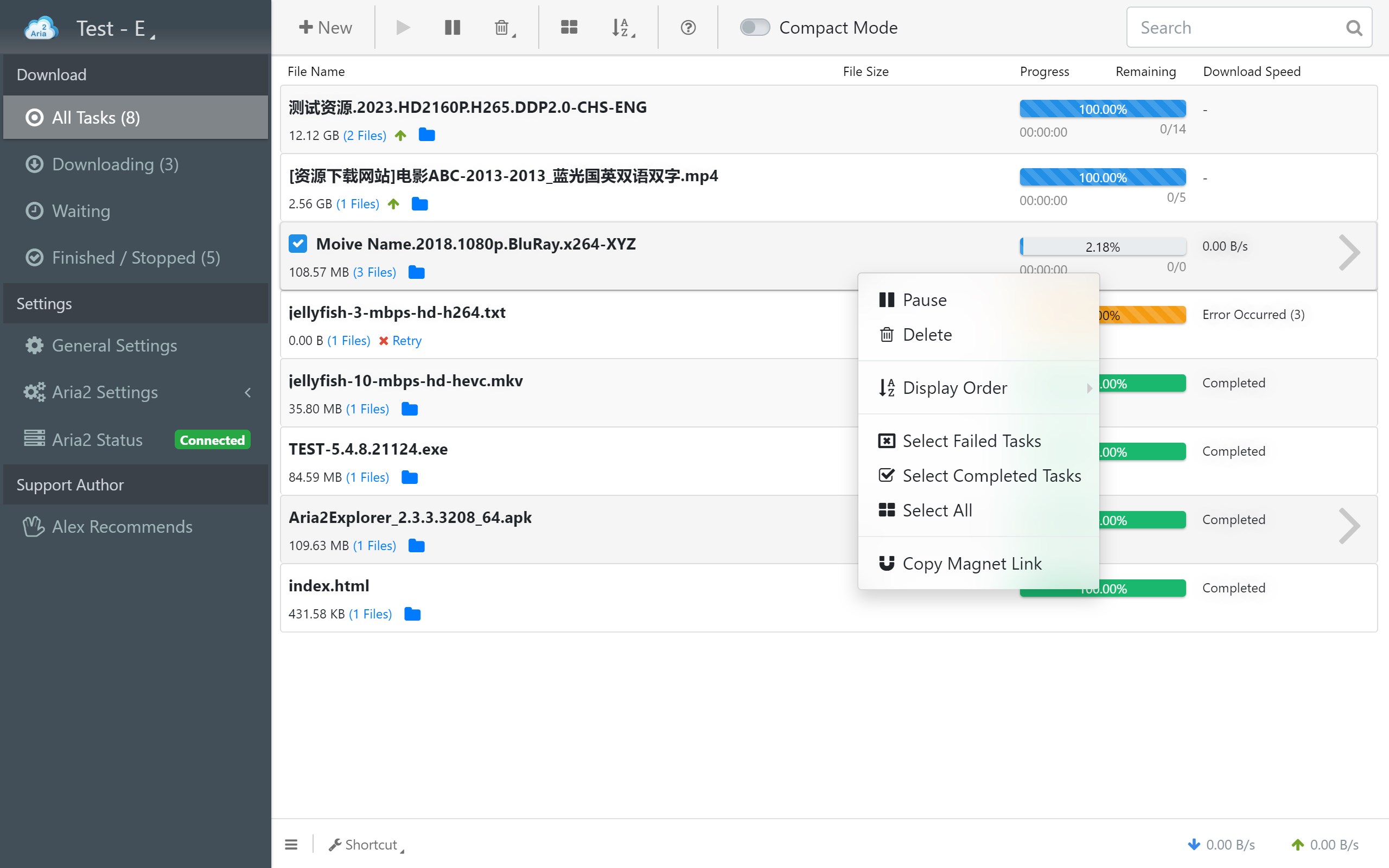 9. Support removing .aria2 control file and download file(s) in task management UI by Shift + Delete.