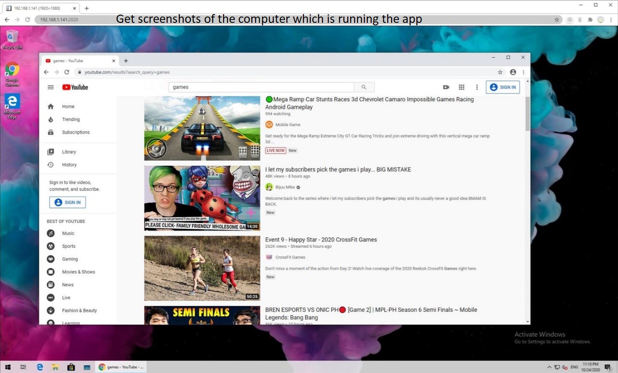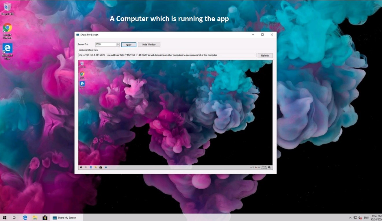 For example, run this app on computer1, and computer2 is connected to computer1. By navigating to https://computer1:2020 in a web browser on computer2, computer1's screen shot will show in the web browser. Refresh the page to get updated screenshot.