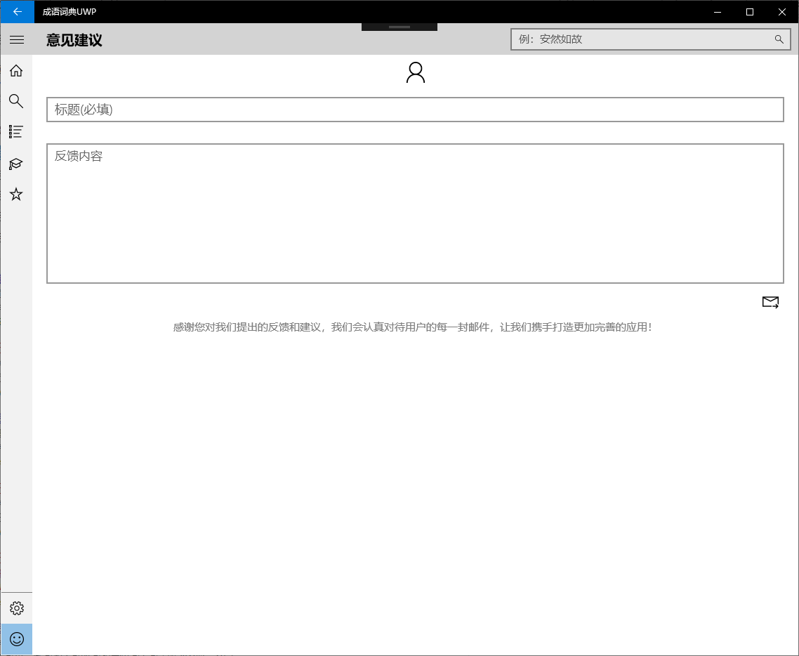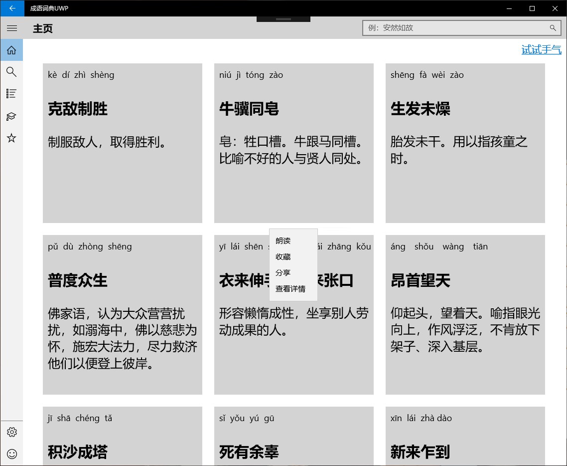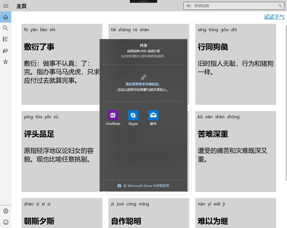 帮助人们学习成语,并在日常生活中应用成语,同时能够是用户在Windows 10的PC、Tablet、Mobile设备上得到统一的体验,用户可以随时随地使用你的Windows 10设备进行成语学习。