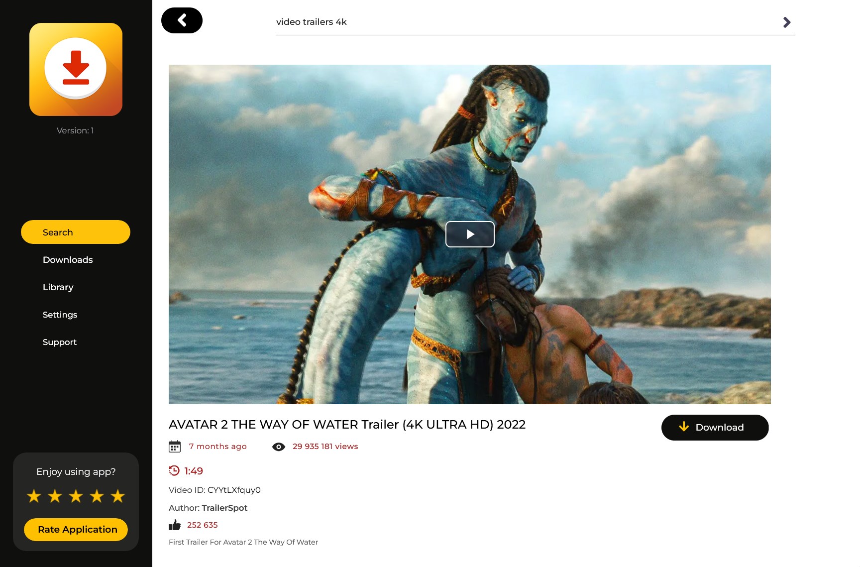 Snaptube YT Video Downloader is an application that will allow you to browse all content from YouTube, as well as download movies and music for later listening or watching without the need to use the Internet. Thanks to the SnapTube Video and MP3 Music Downloader application, you can easily create your movie and music mp3 collection on your hard drive. Using this Snaptube YouTube Download application is very simple and intuitive. All you have to do is enter the search phrase and the application will display all YouTube results. Then, by clicking on the details of a given video, you can play it or click "Download" to choose the resolution you are interested in. The application also allows you to download materials in high resolution FullHD, 1080p and 2160p 4K up to 60fps.