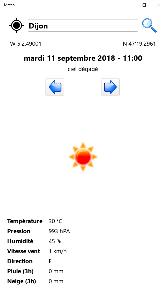 Quel temps fait-il ? Il suffit de le demander à cette application qui, en utilisant les données d'OpenWeatherMap, peut vous donner les prévisions à 5 jours du lieu où vous êtes (géolocalisation) ou d'une ville quelconque saisie au clavier.