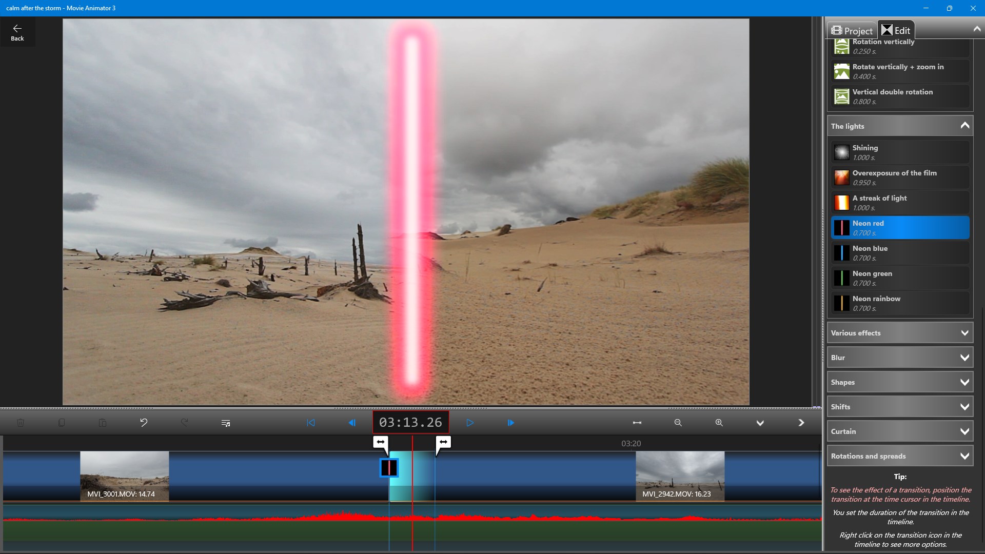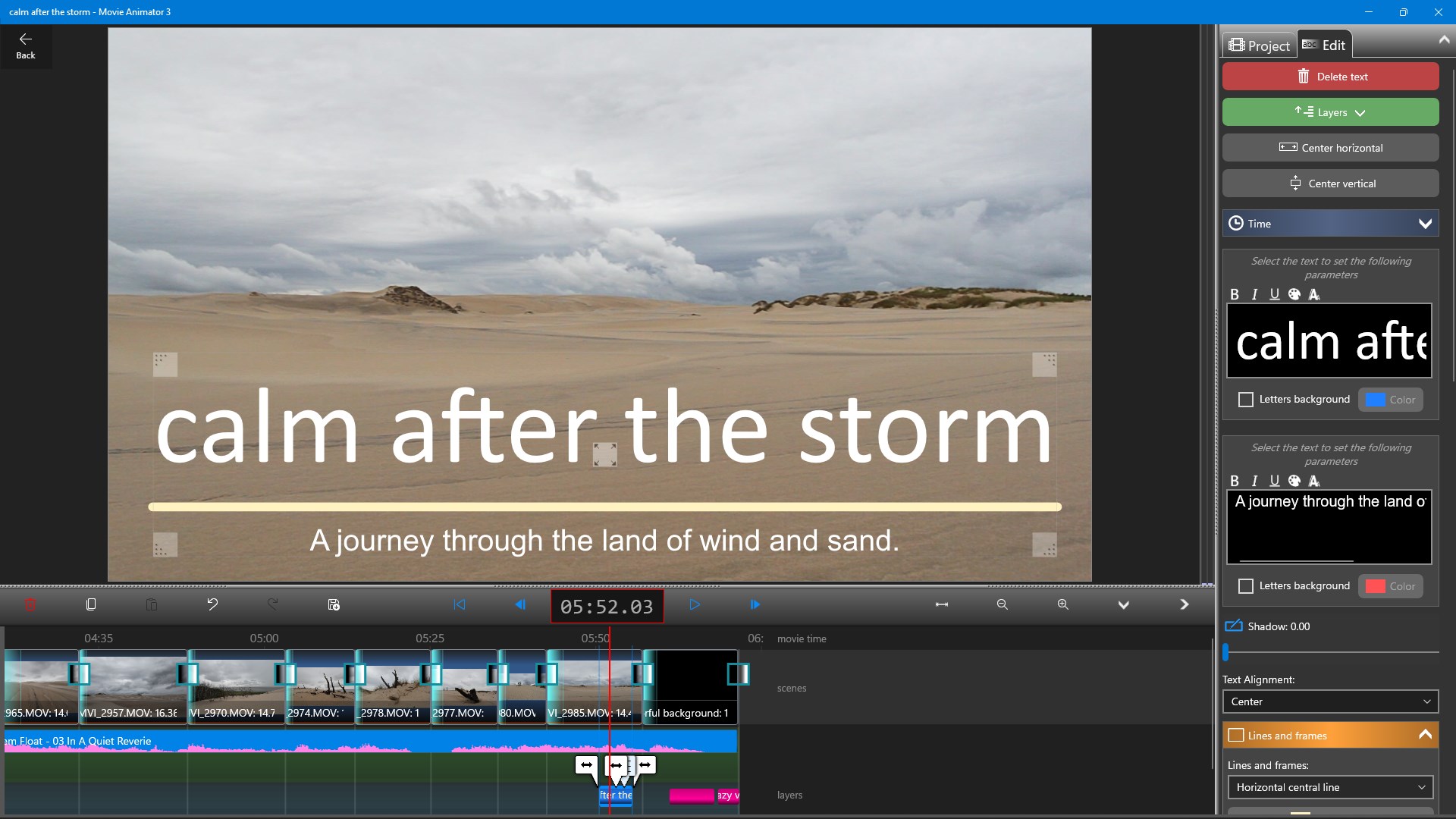 Movie Animator 3 is a very advanced and yet the easiest to use movie editor currently available in the Microsoft Store. You do not need to be an expert on video editing to create spectacular videos composed of pictures, videos, sounds, animated texts, special video effects and videos from an in-built camera or captured computer screens. While using the program, you mainly slide events on a timeline with the help of your mouse, pen or touch screen and set parameters for the events. All the component elements of a project are arranged in layers that can be freely and easily controlled.