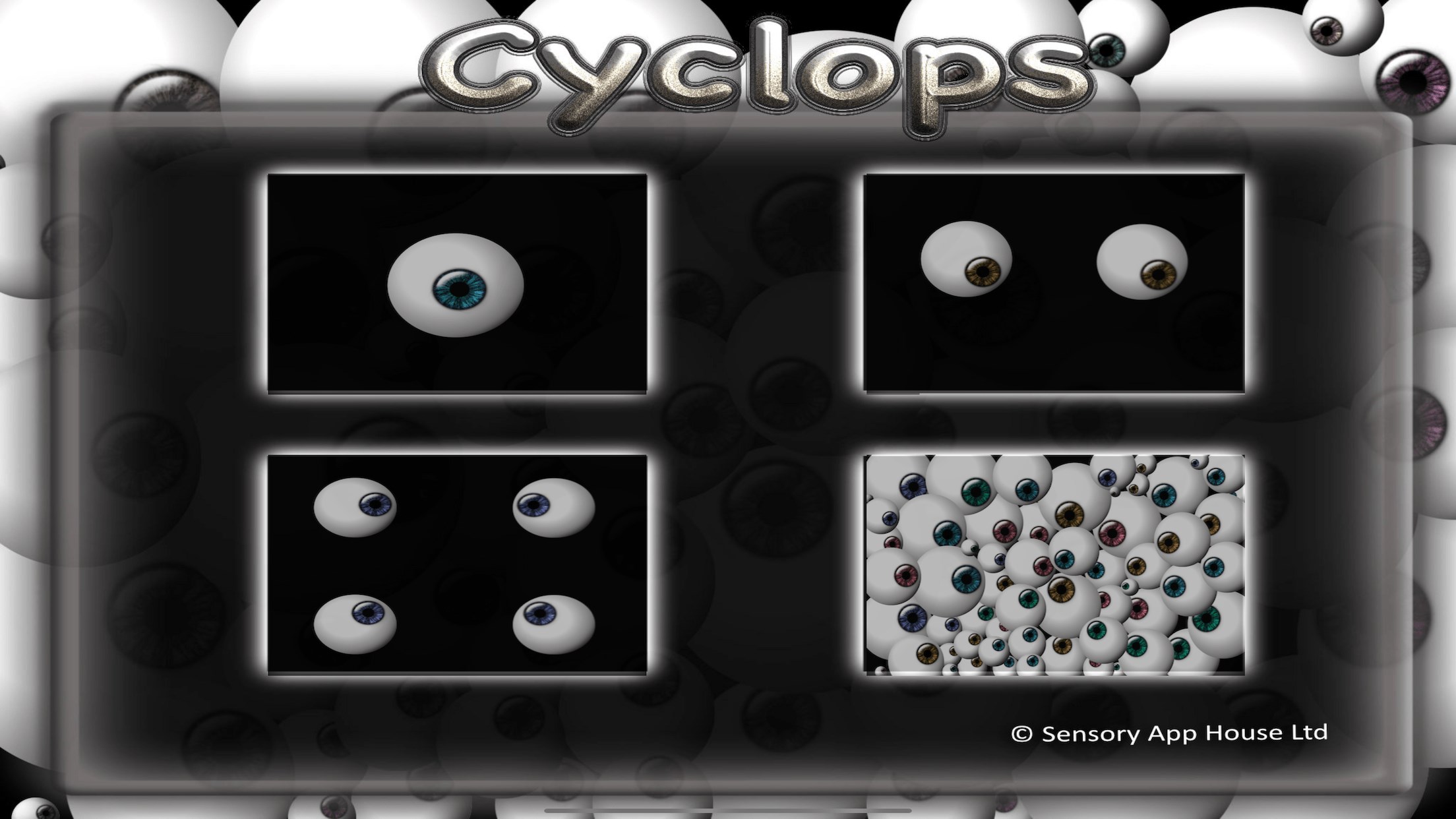 Sensory Cyclops is a curiosity. Touch and move slowly around the screen and the eye or eyes will follow you. It is an easy to use app for early learners or special access situations. Its an unusual activity!