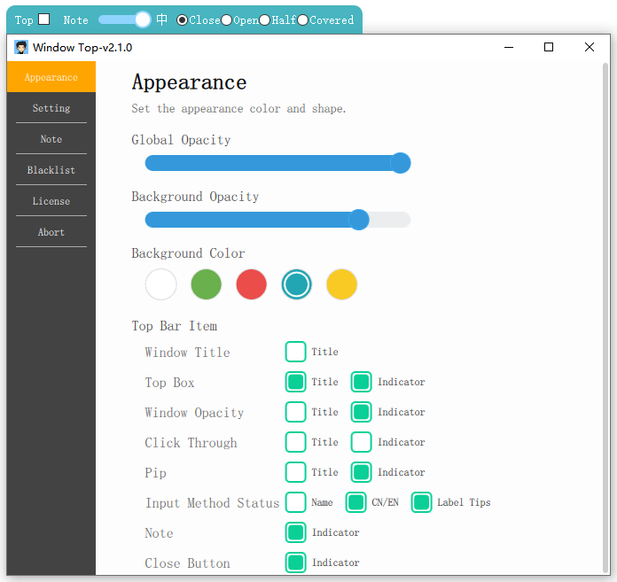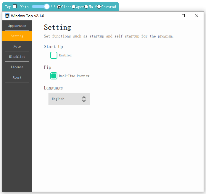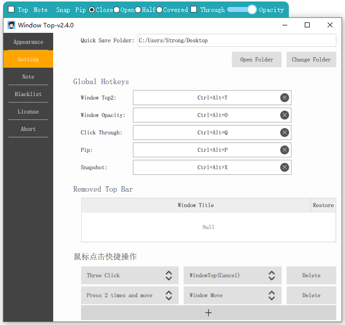 Convenient window topPersonalization, transparency and background color of the top barTransparent window, mouse penetrationWindow picture in picture, real-time preview, the window is semi occluded or fully occluded, drawing small windows from the animationInput method status promptBlacklist filteringEasy note functionGlobal hotkeys, mouse shortcutsWindow screenshotWindow GIF/Video recordPaste a image