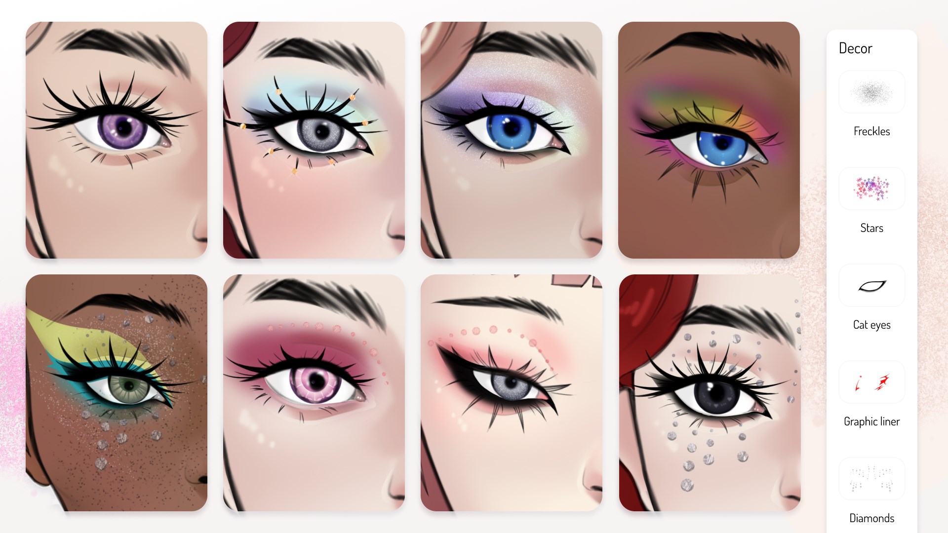 Unleash your imagination and color face charts to visualize your desired makeup look before application. Or just have fun :)