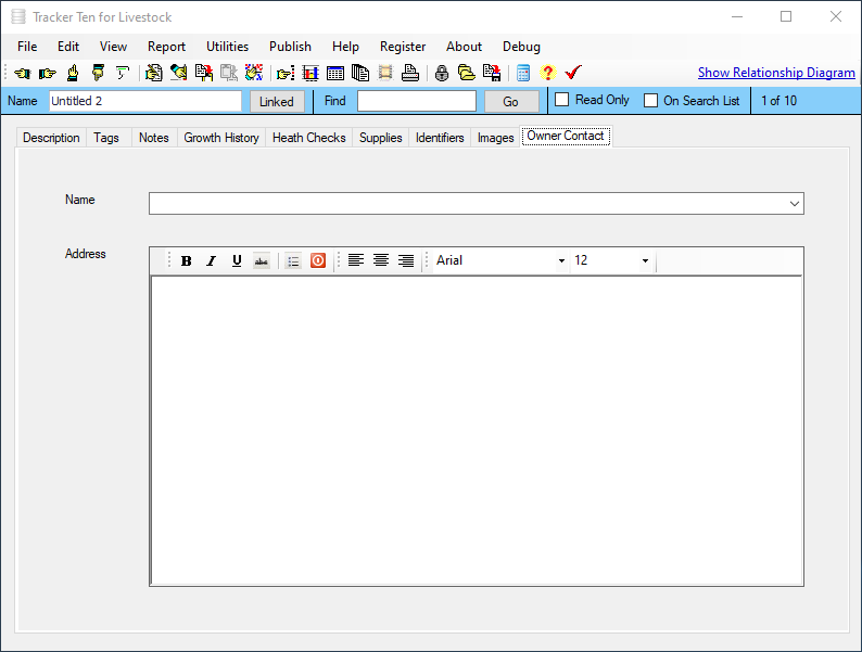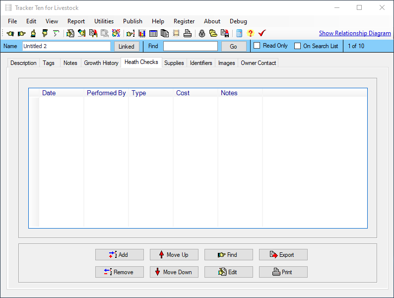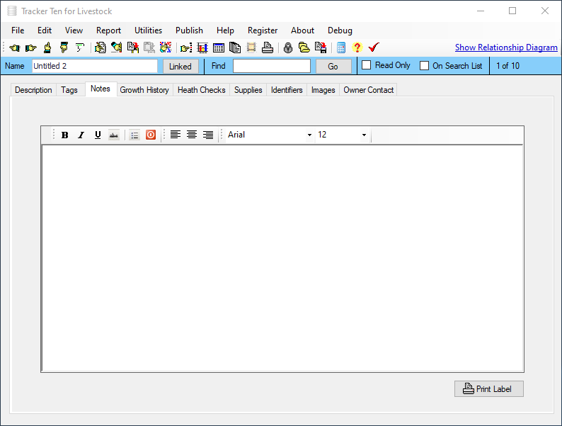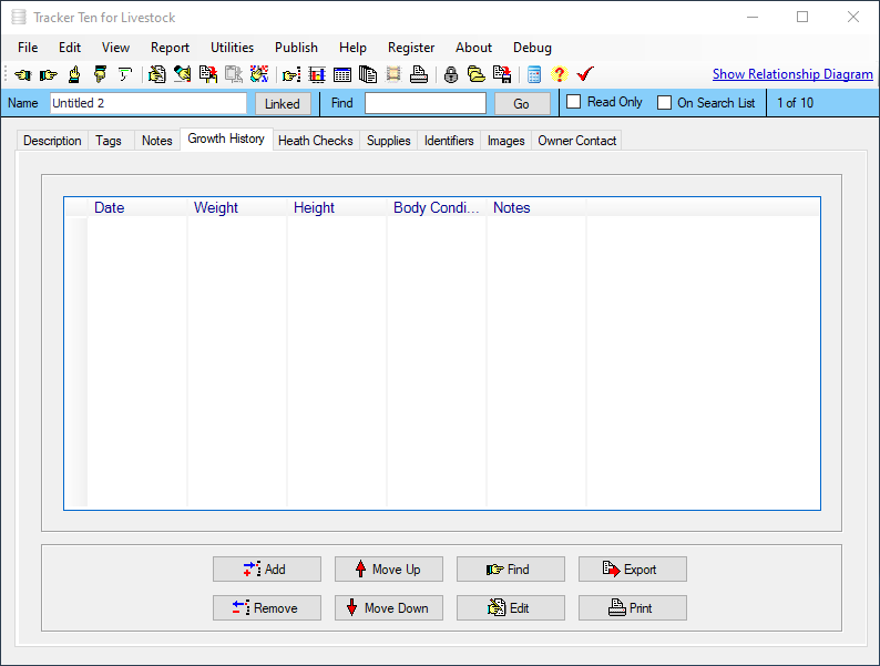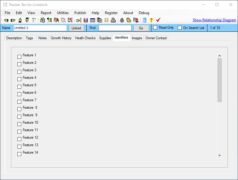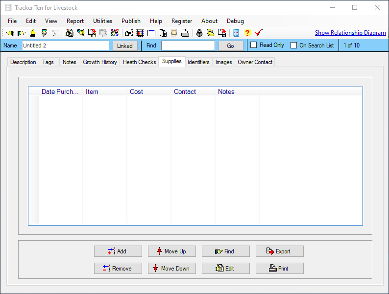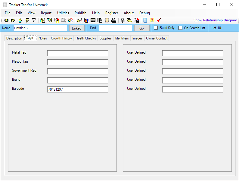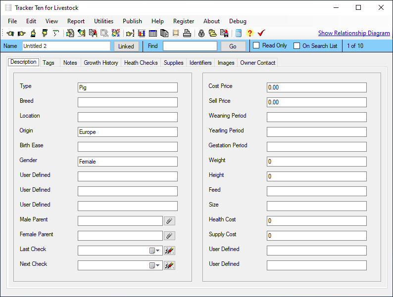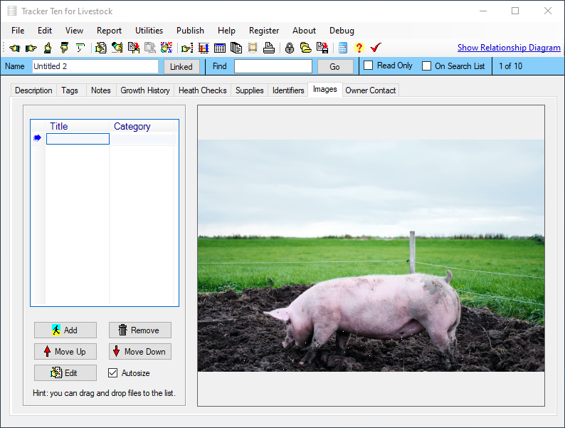 Are you looking for a quick and easy way to keep track of your livestock or animals? Look no further then Tracker Ten for Livestock. Tracker Ten can effortlessly track animal description, type, size, weight growth history, medical history, relationships, female parent, male parent, id numbers, brands, cost price, sell price, origin and much more. You can also include up to 100 pictures or document scans for each animal. The software is great for all types of ranches and farming operations. And since you can easily customize the fields to suit your needs, the software will work for any type of livestock.