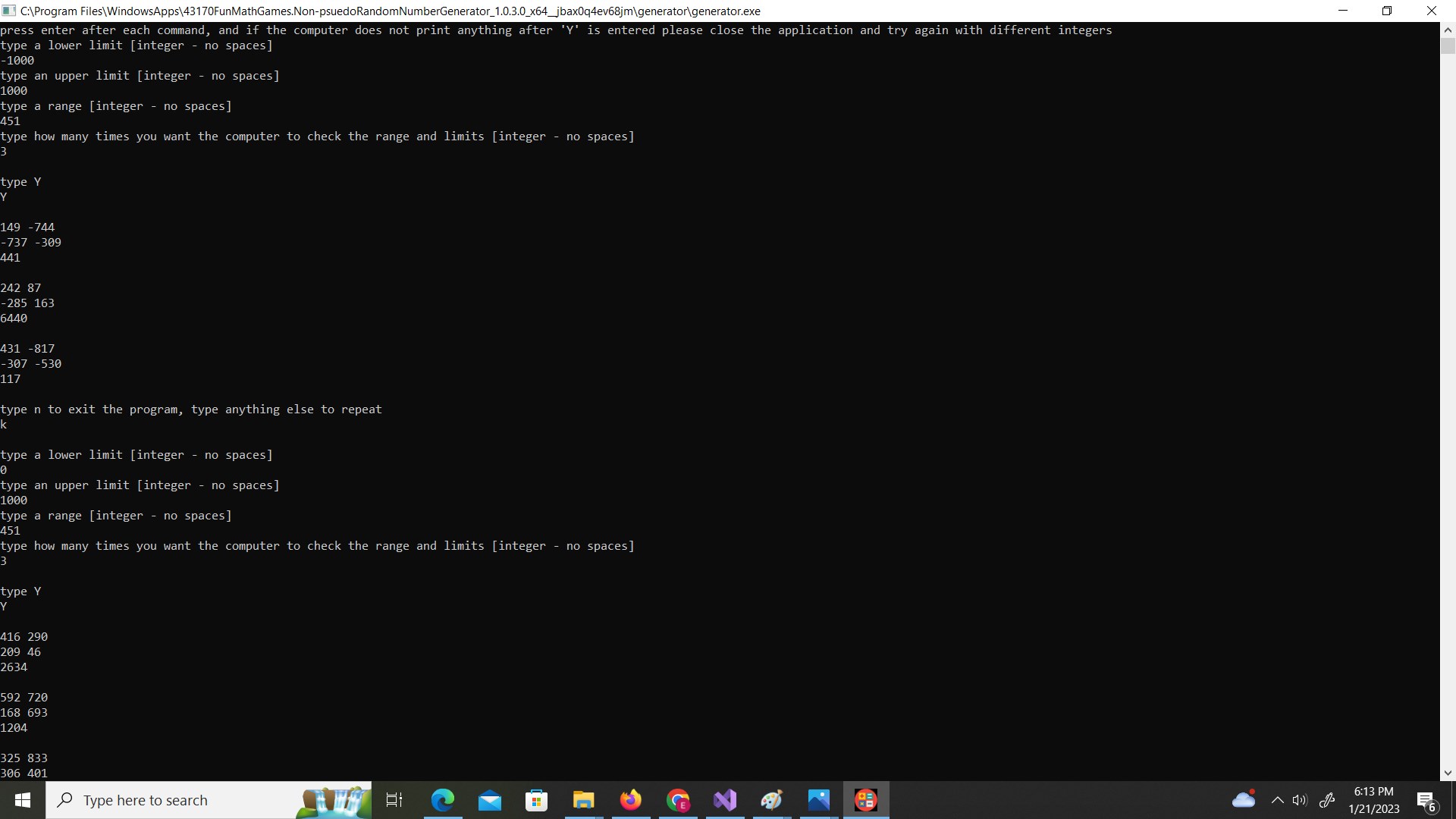 A game that uses prerequisite user entered parameters to generate five random numbers (four within a range) at the same time. Follows the laws of probability. Can be used to study the laws of probability and number theory.