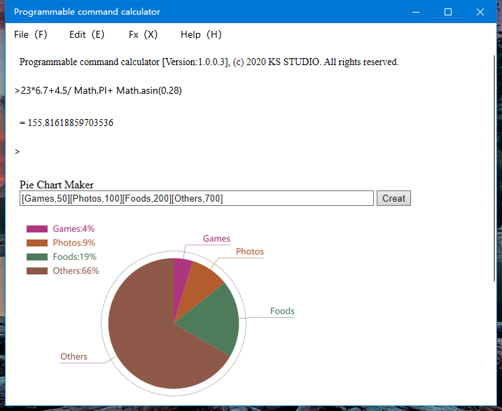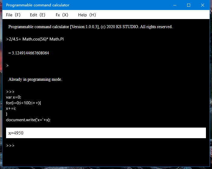 Command calculator is a multi - functional mathematical calculation aid tool, which supports common mathematical and scientific operations.With the command line method, you can write your own expressions at will, and you can switch to programming mode to write your programs, and perform complex mathematical operations.