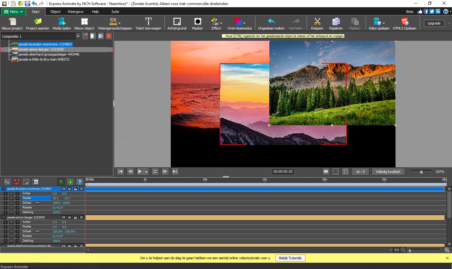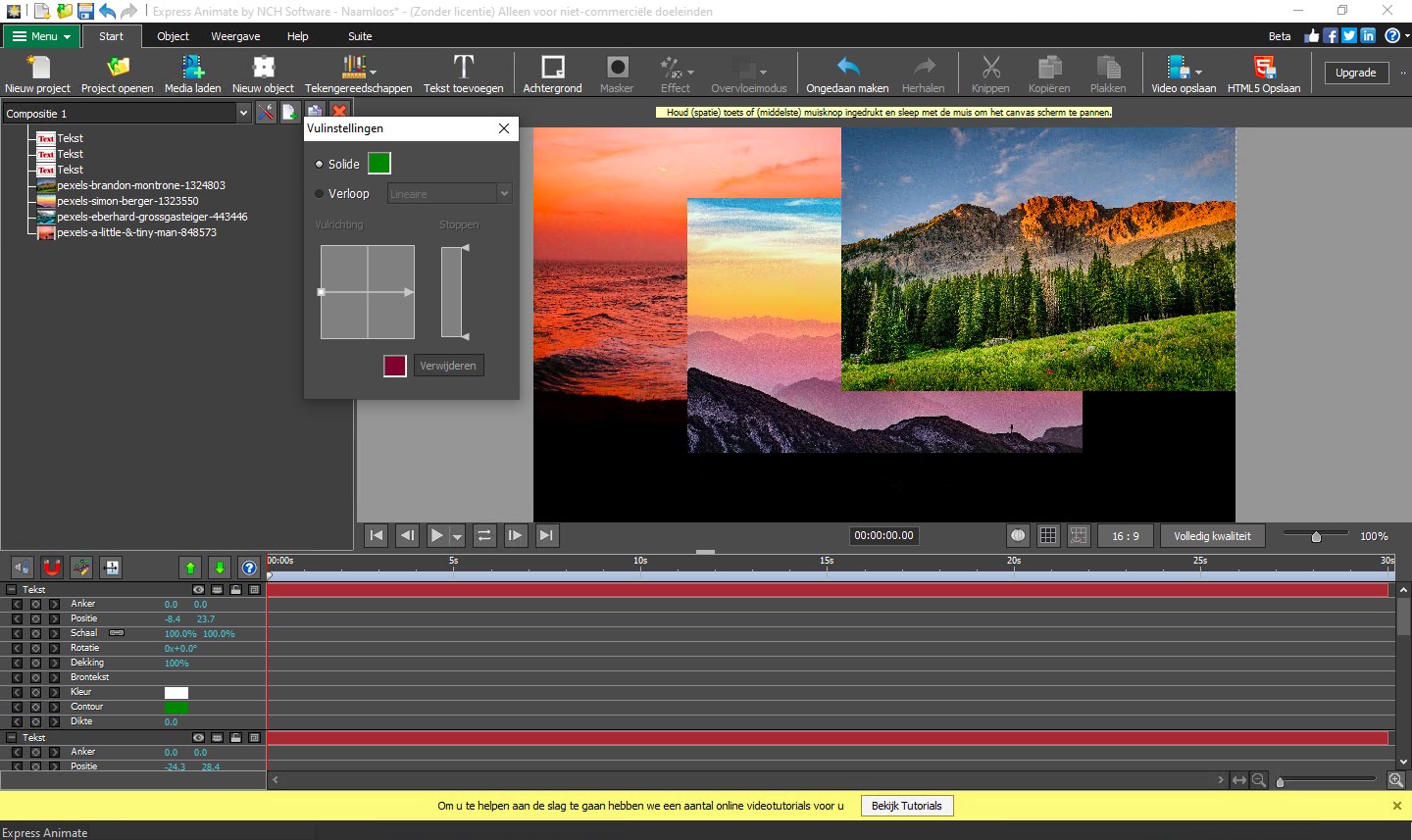 Voeg digitale effecten toe aan uw animaties en video\'sKeyframes kunnen worden toegepast aan objecten en parametersUpload audio of neem audio op en bewerk ze met unieke effectenMaak tekst animatie\'s en tekst balonnenGeavanceerde gereedschappen voor ervaren animators en grafisch ontwerpers, waaronder vector maskers, meng modi en meerExporteer als video, flash, html5 of GIF