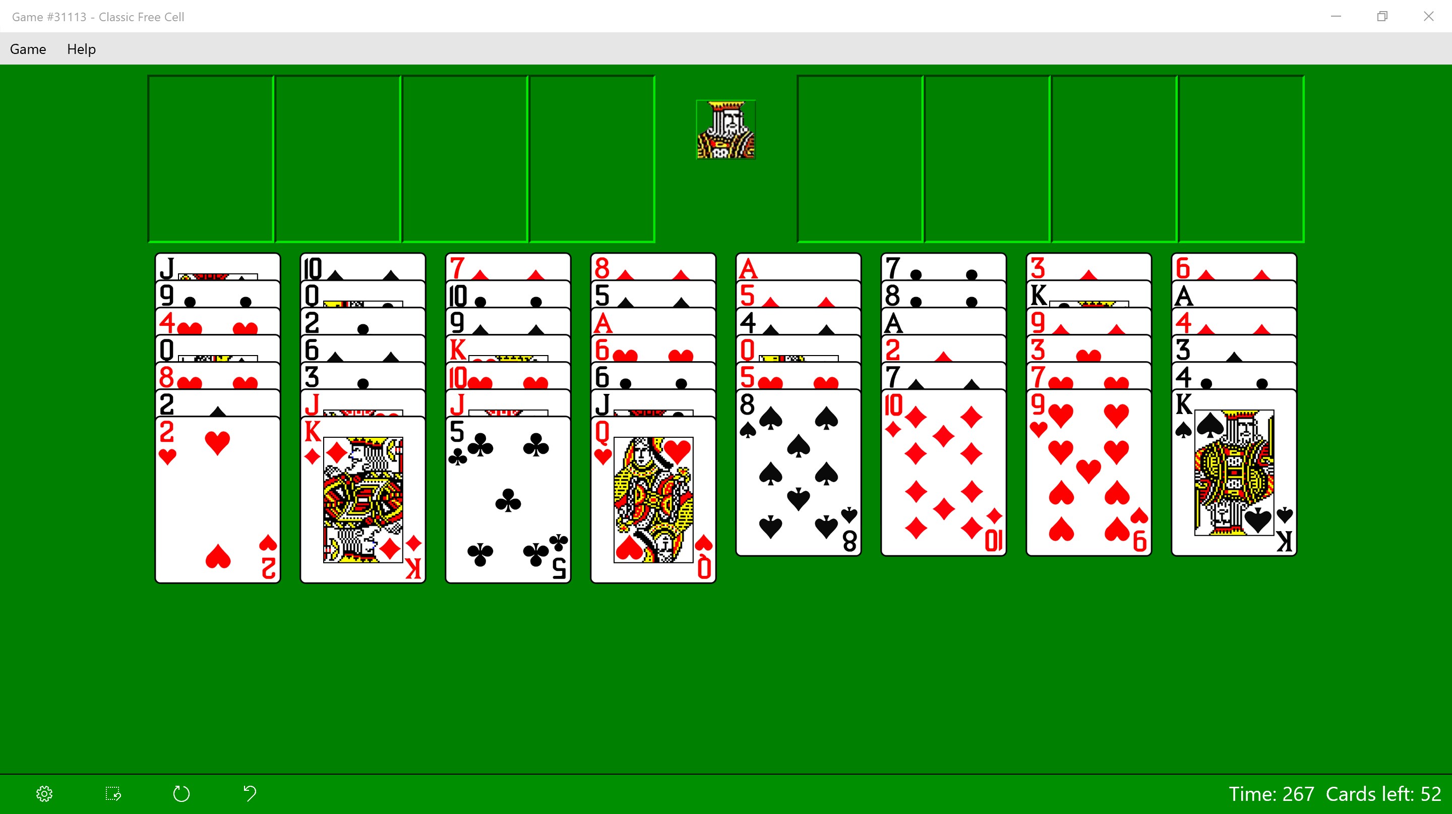 Classic Free Cell solitaire game. Looks and feels just as old desktop solitaire that we played for a long time. Same scoring system, similar graphics, king image.