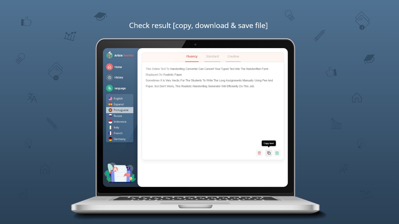 Copy the ResultsDownload the ResultsEasy-to-Spot ChangesThree Different ModesWord ChangerSentence Changer Plagiarism RemoverMultiple Languages AvailableHistory