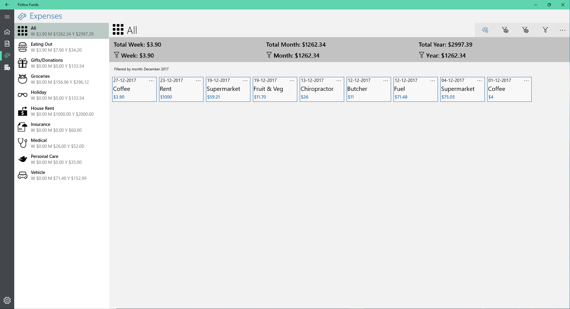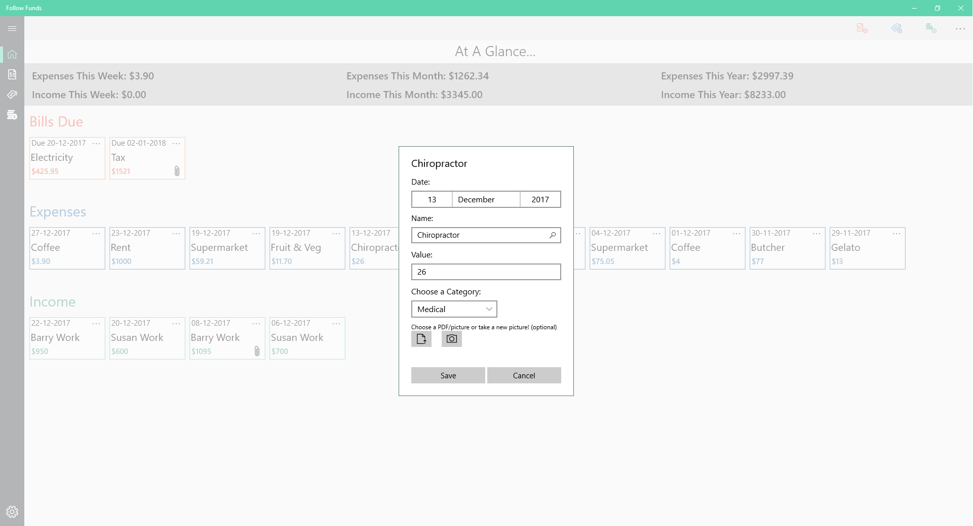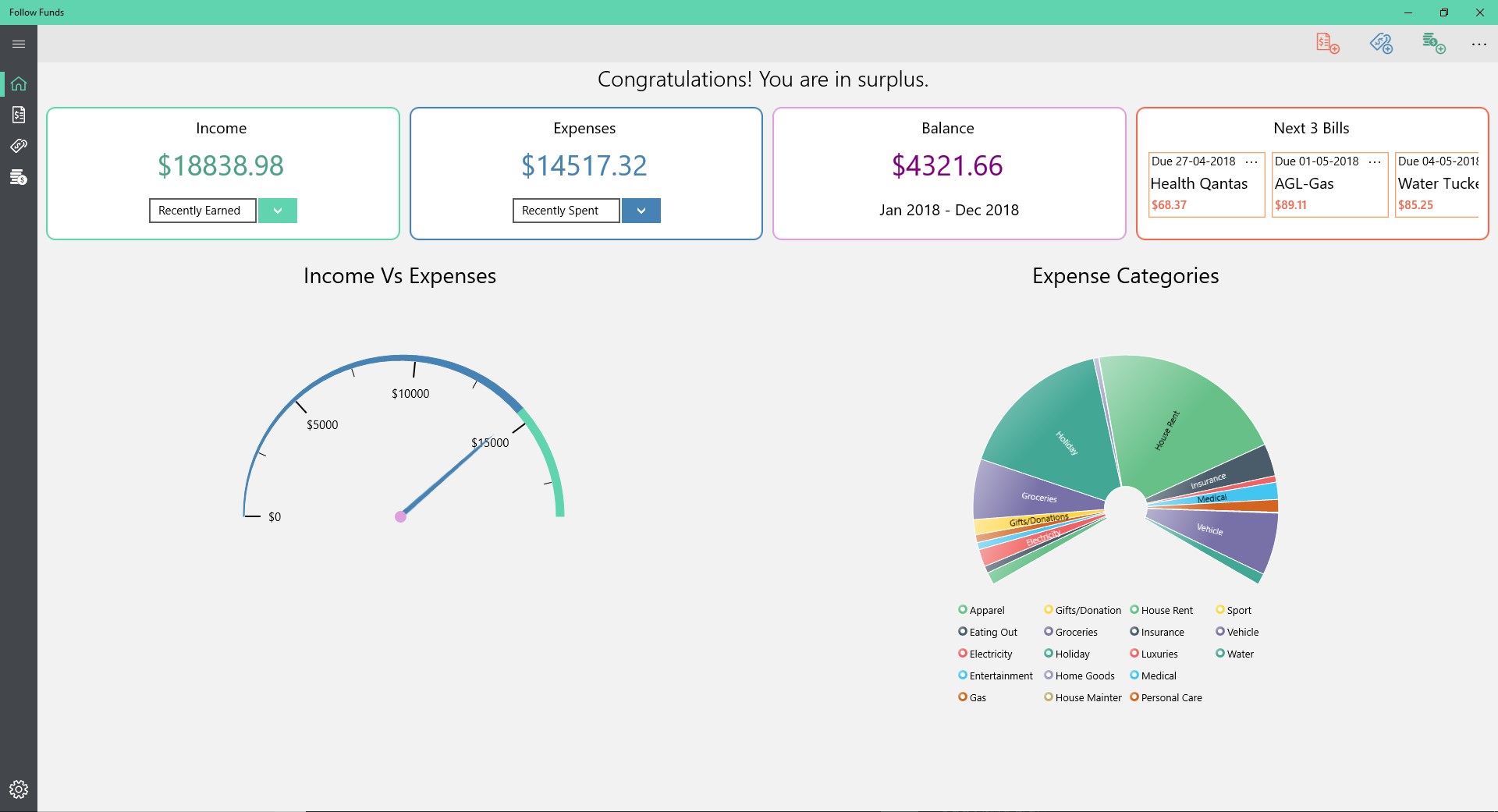 Keep track of your expenses with Follow Funds. You'll never be in the dark again. Don't feel restricted to just expenses and bills though...You can also track your income!