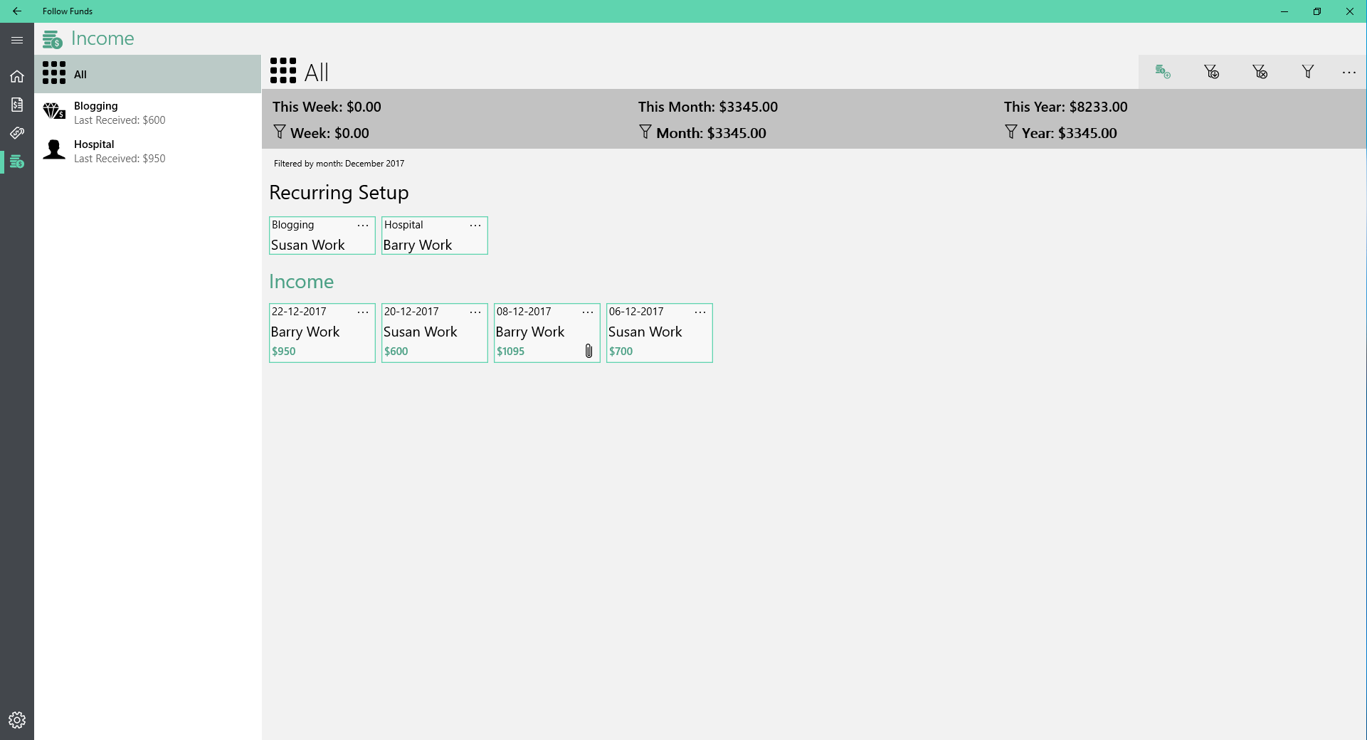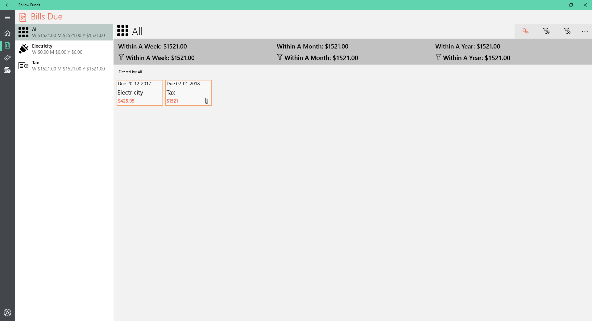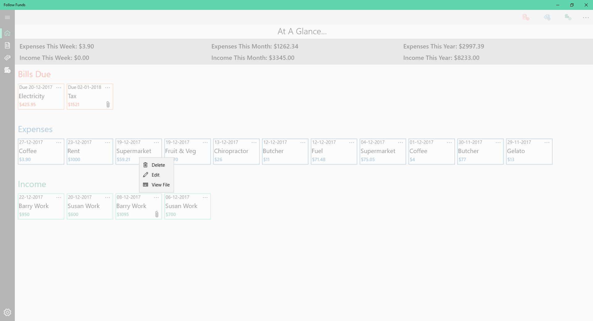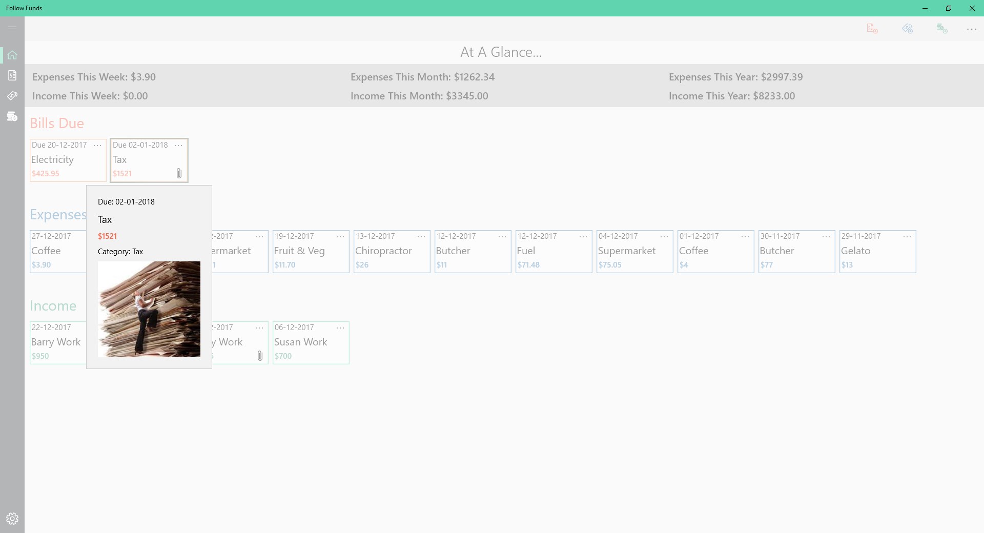 Keep track of your expenses with Follow Funds. You'll never be in the dark again. Don't feel restricted to just expenses and bills though...You can also track your income!