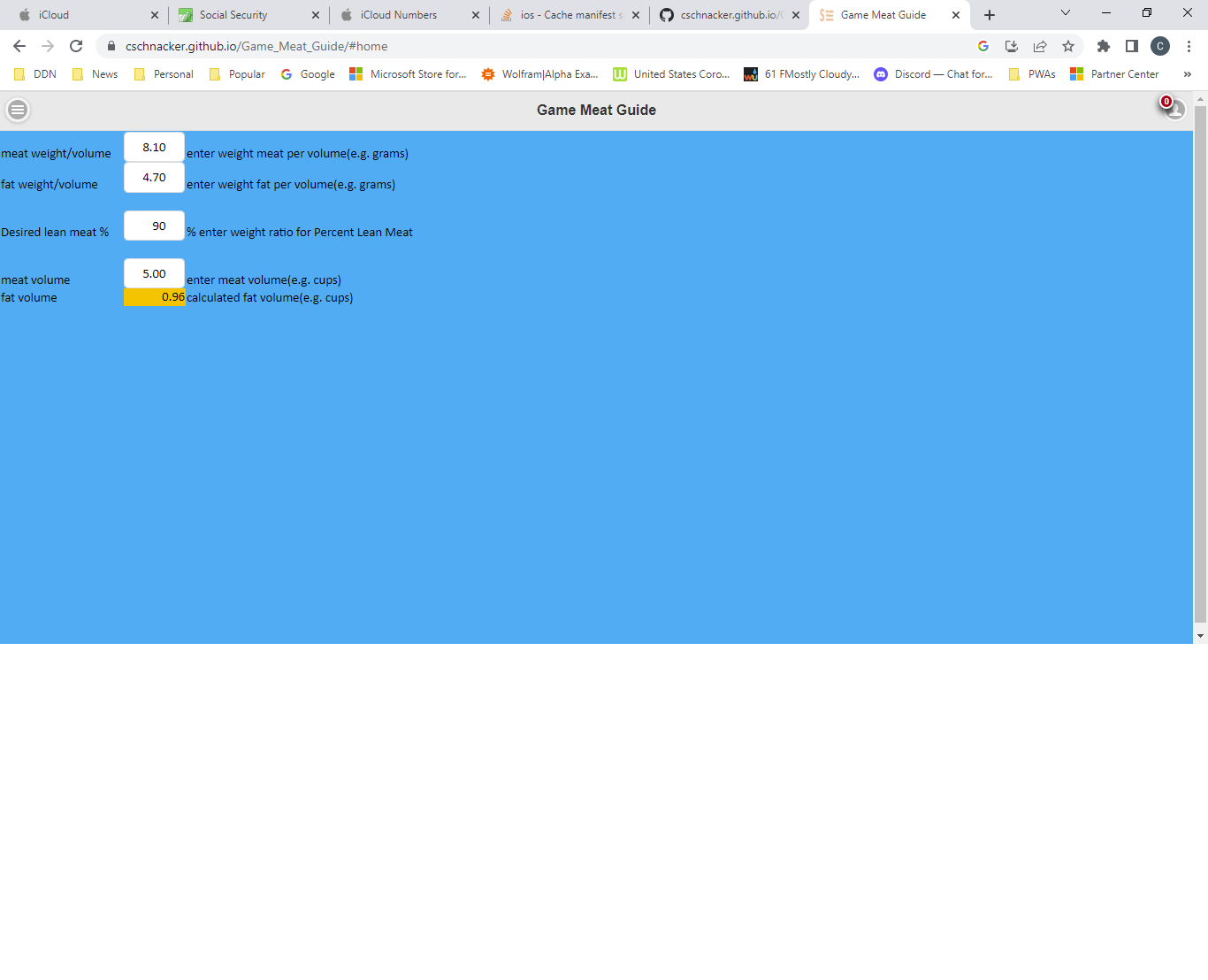 Game Meat Guide calculates the exact volume ratios to mix of lean meat and fat/tallow to get the percent by weight lean meat burger (example 90% burger).