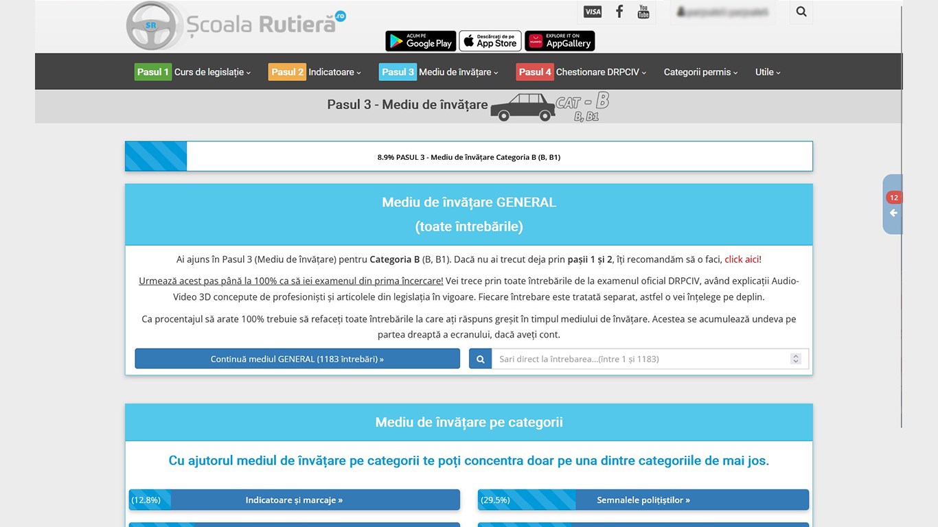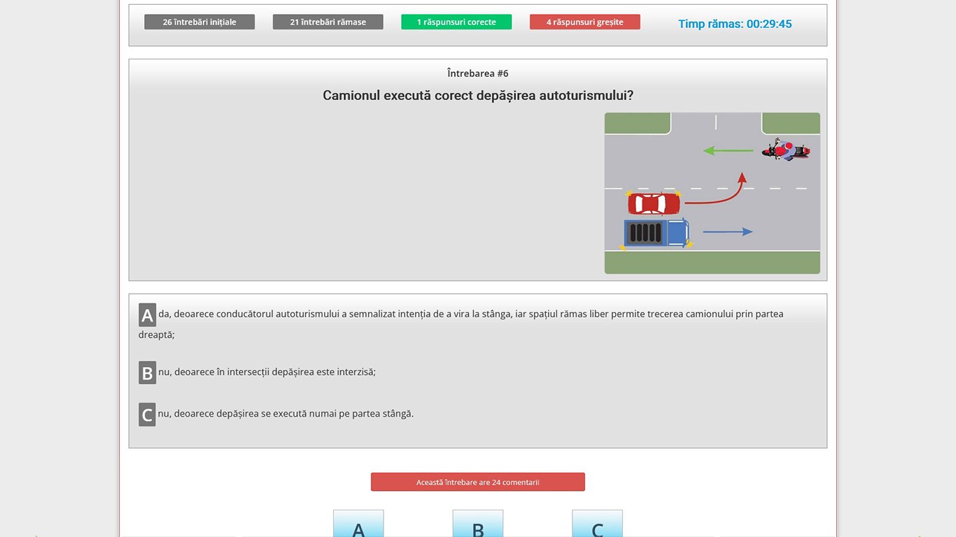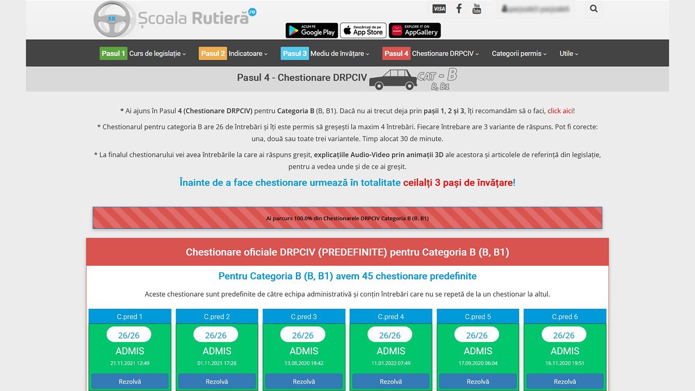 În „Pasul 4 - Chestionare DRPCIV” îți vei testa cunoștințele acumulate deja din primii trei pași de învățare. Iar în caz că vei răspunde greșit la unele întrebări, la final de chestionar le va afișa pe acestea la care ai greșit, împreună cu variantele corecte, explicațiile Audio-Video și articolele de lege actualizate la zi.