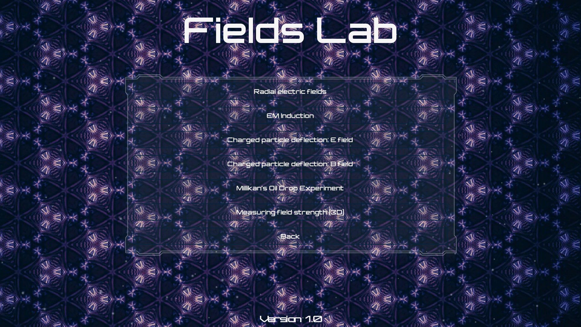 Fields Lab is a series of interactive physics simulations of applications of electric and magnetic fields intended for teachers and students in Secondary education. It includes 2D simulations of charged particle deflection in electric and magnetic fields, electromagnetic induction, Millikan's oil droplet experiment and the combined electric field around multiple spherical charges. It also contains a 3D simulation for calculating electric and magnetic field strength. Further simulations will be added with future updates.