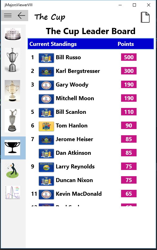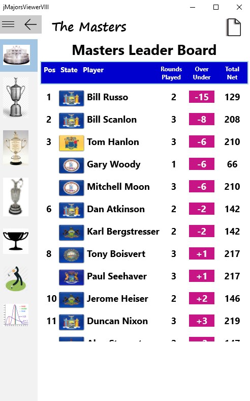 jMajorsViewer is a complimentary application to the jMajorsIV app for managing golf tournament data. The viewer allows the user to view leader board data and cup point standings for a single group based on the data managed in the jMajorsIV app. The Group tourney manager provides the necessary data files to the user through email which are then downloaded to a defined directory listed in the download instructions. Information on players competing in the group is available on the Players Information Page. Player statistics on rounds played can be viewed on the Statistics Page. Note that data contained in the files used by this app are also applicable to the jRingersVII app available at the Microsoft App Store.