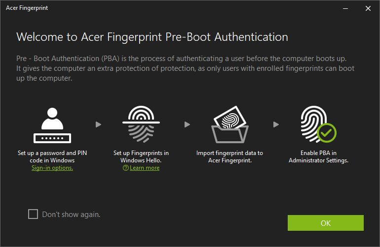 Pre-Boot Authentication (PBA) is the process of authenticating a user before the computer boots up. It gives the computer an extra protection of protection, as only users with enrolled fingerprints can boot up the computer.