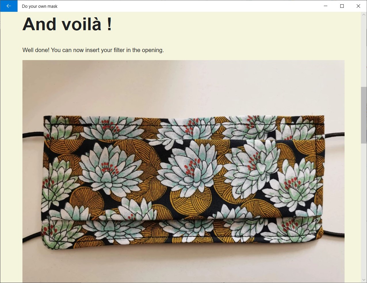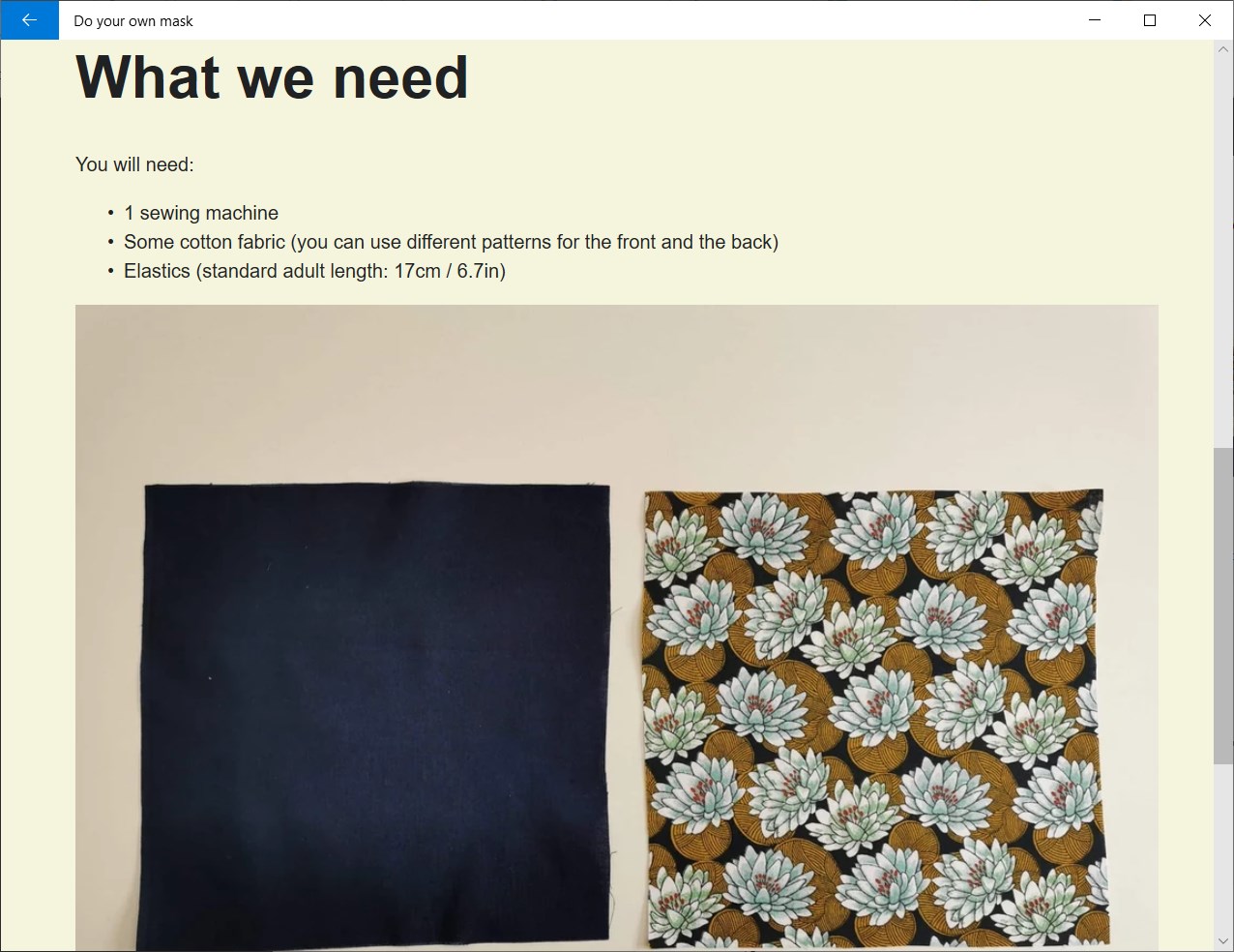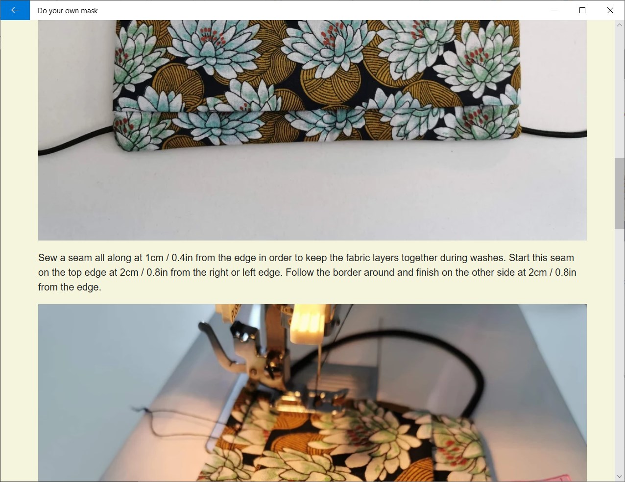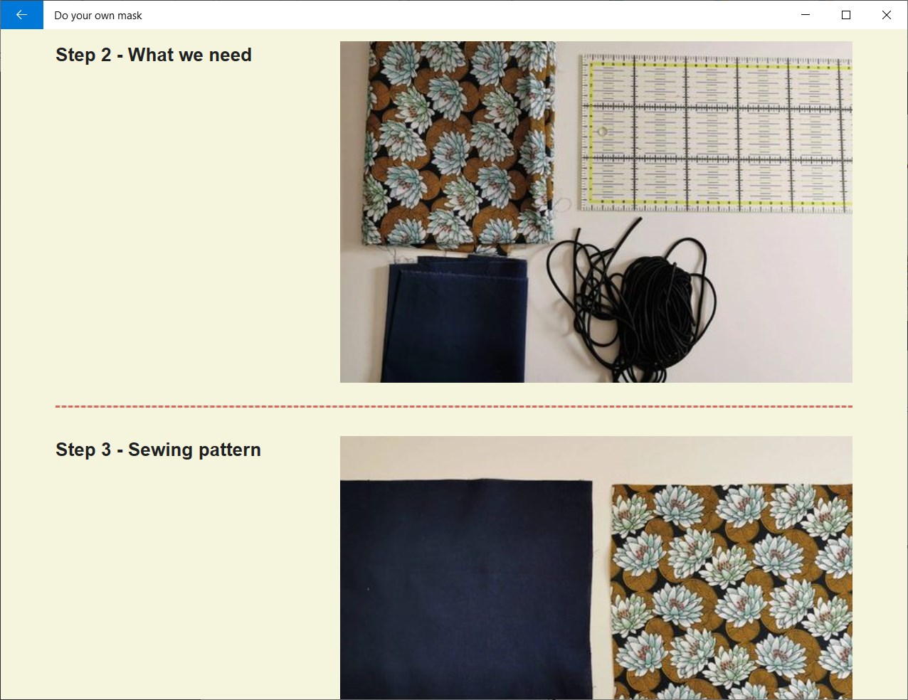 You can select two different kind of mask instructions : with a sewing machine or without a sewing machine. Both present pictures, easy to follow steps, and tips to assist the user.