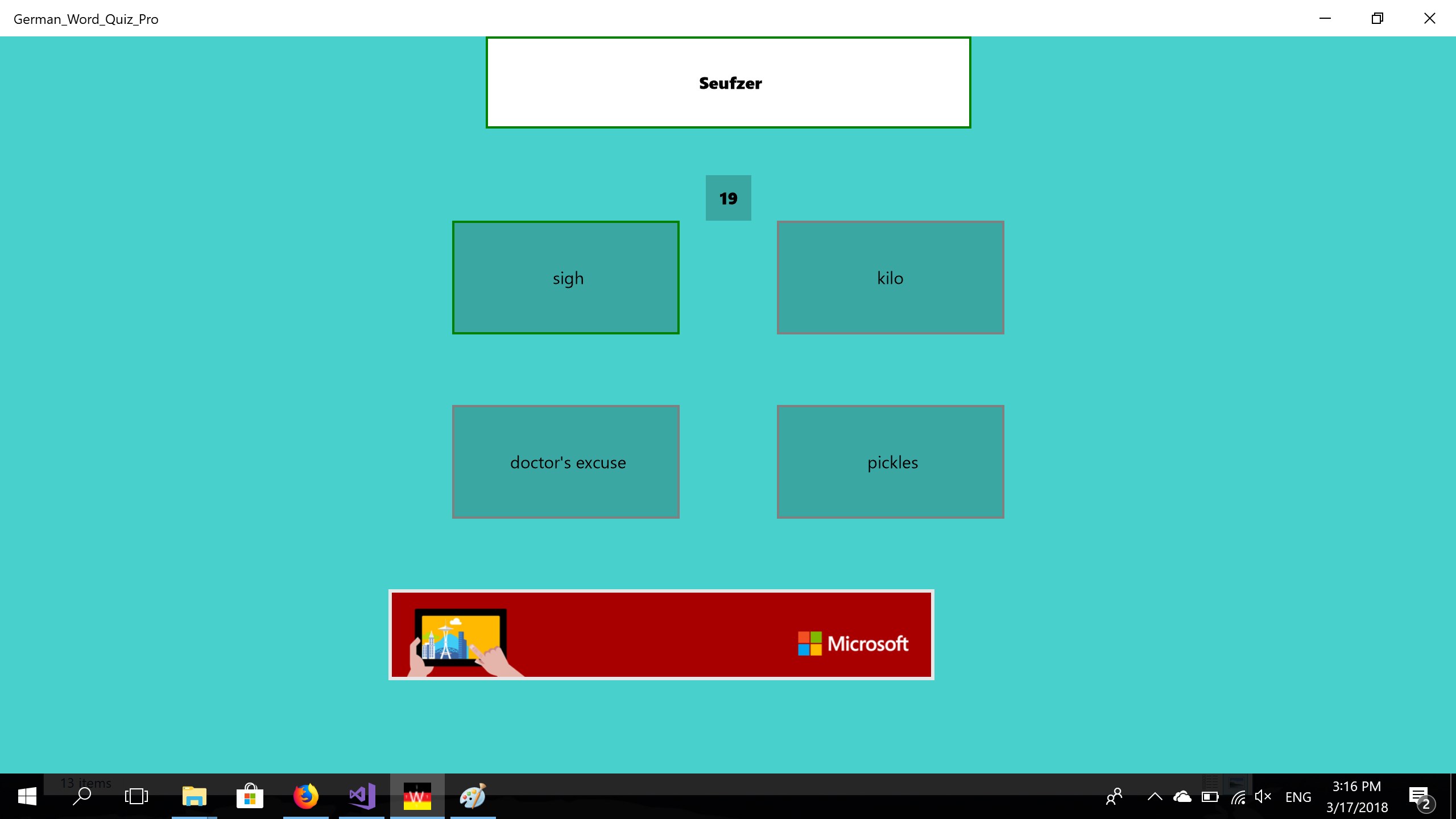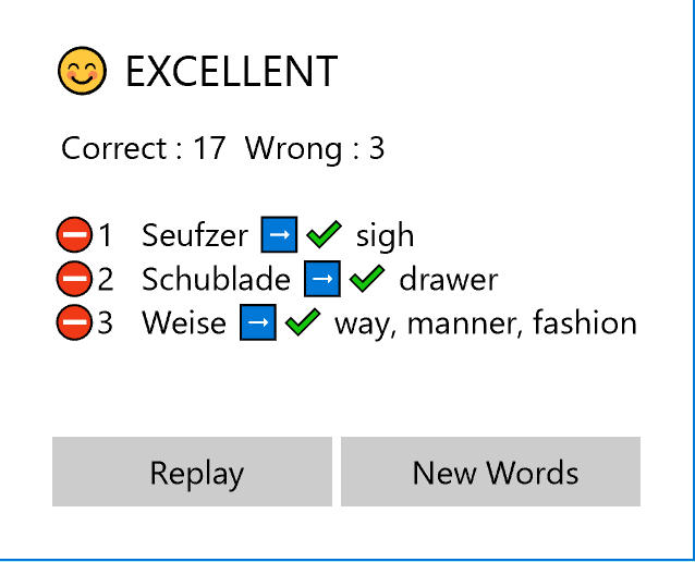 German Word Quiz Pro will help you to learn German words. This App includes most used about 1000 top German words and asks them randomly. You will asked 20 questions and can at the end of quiz, replay the same words or decide to get new 20 words.