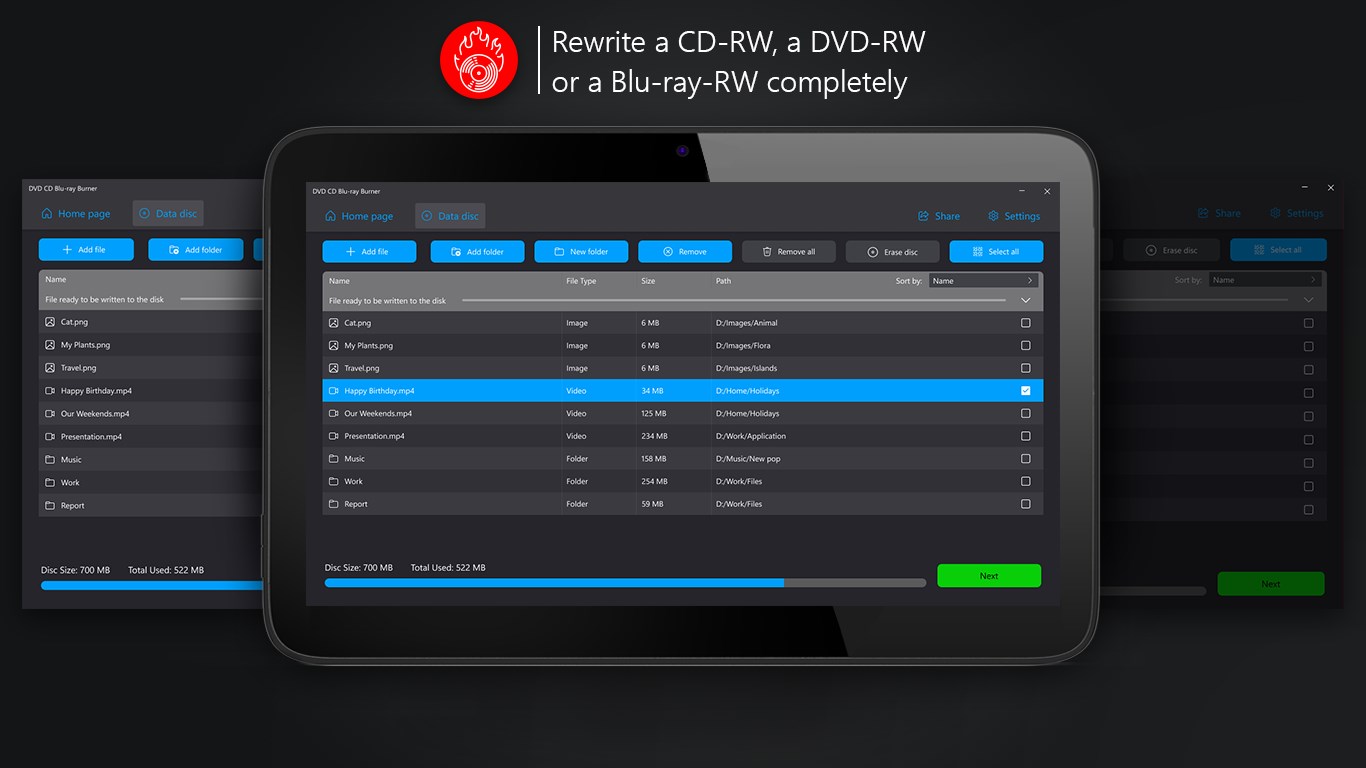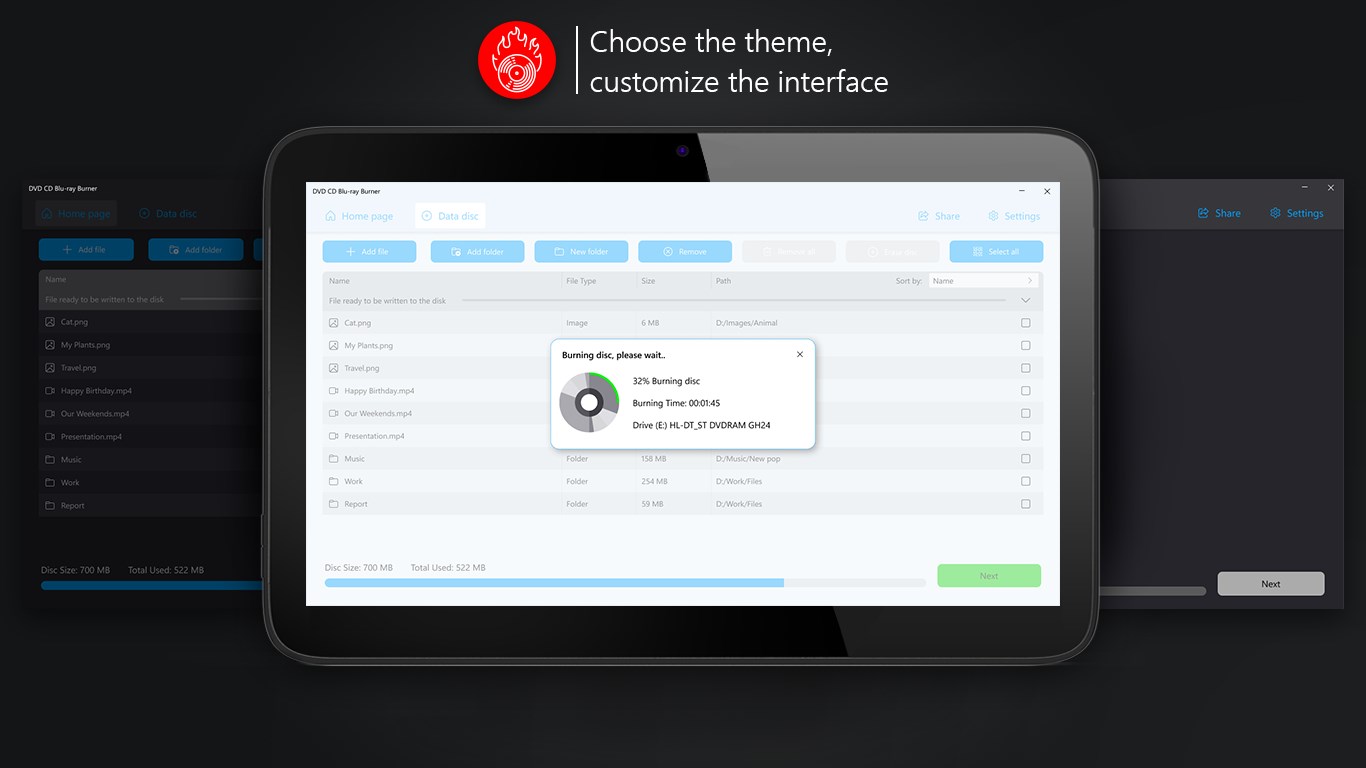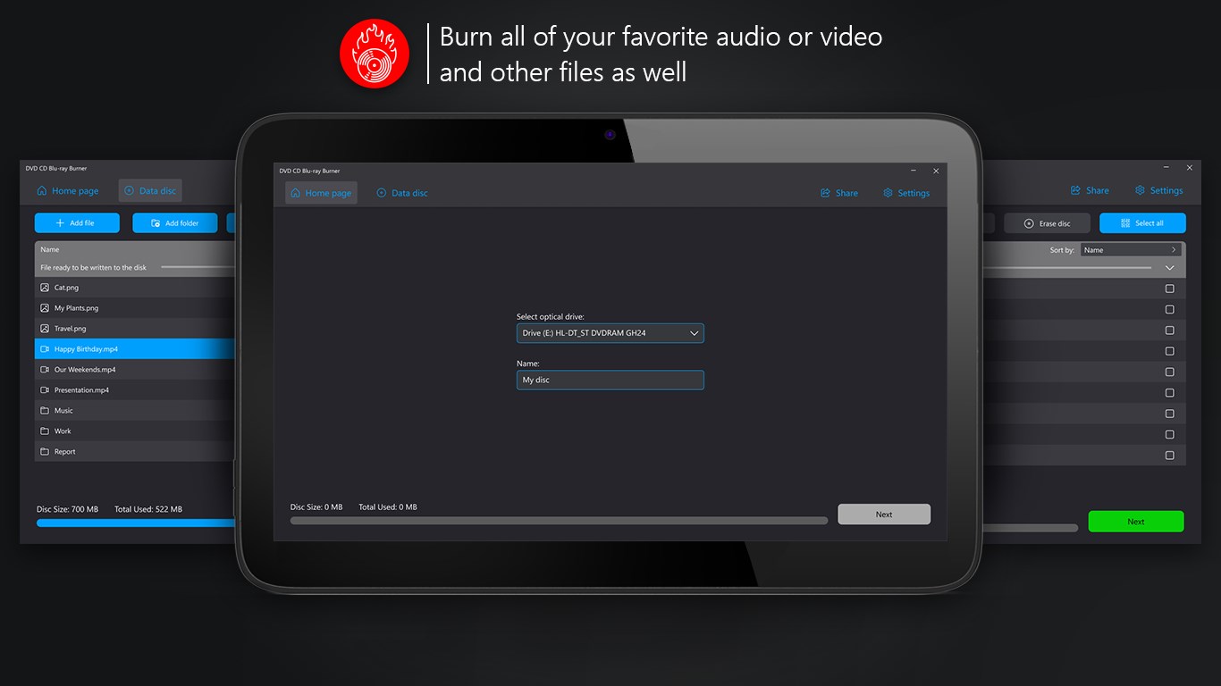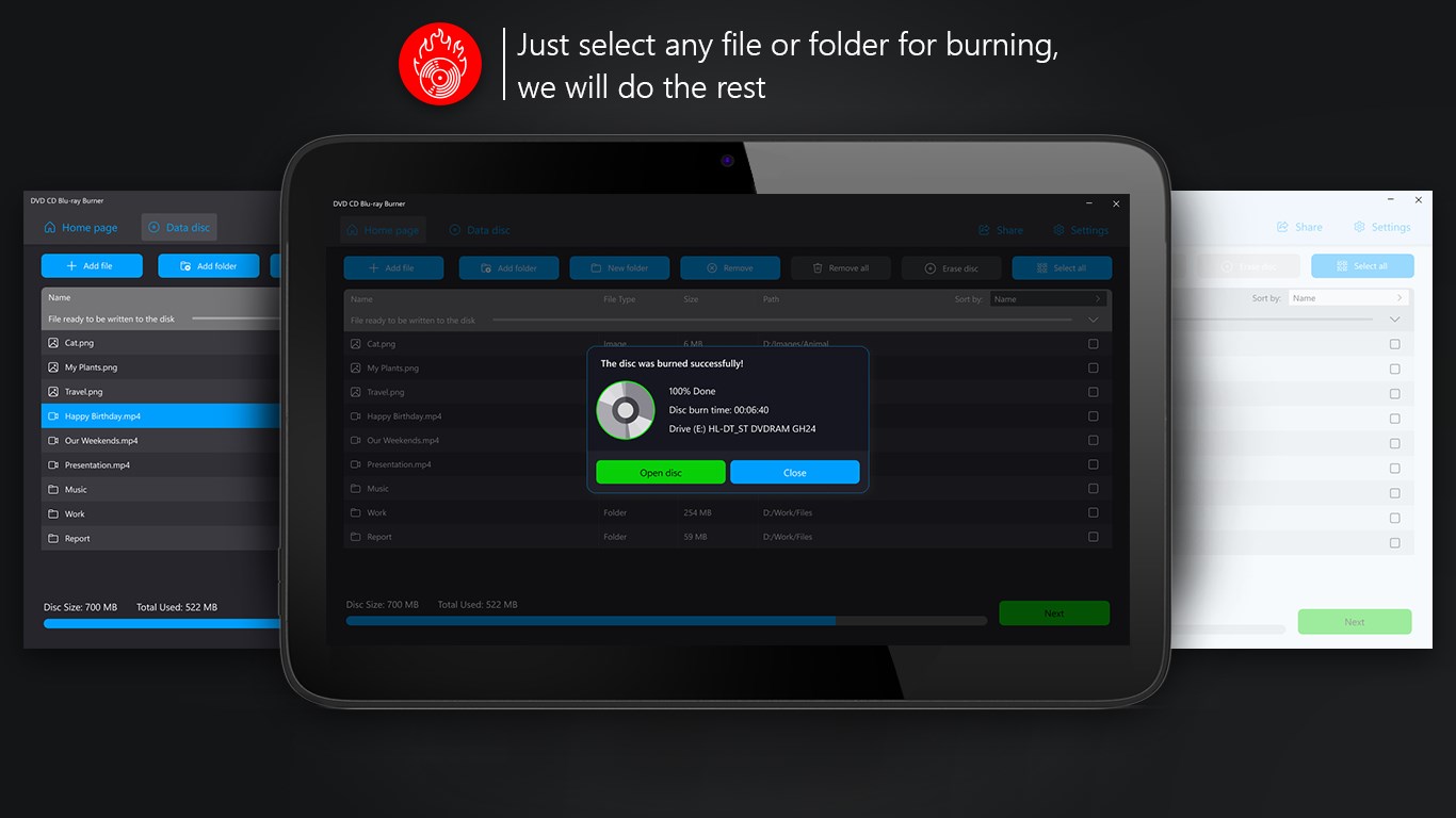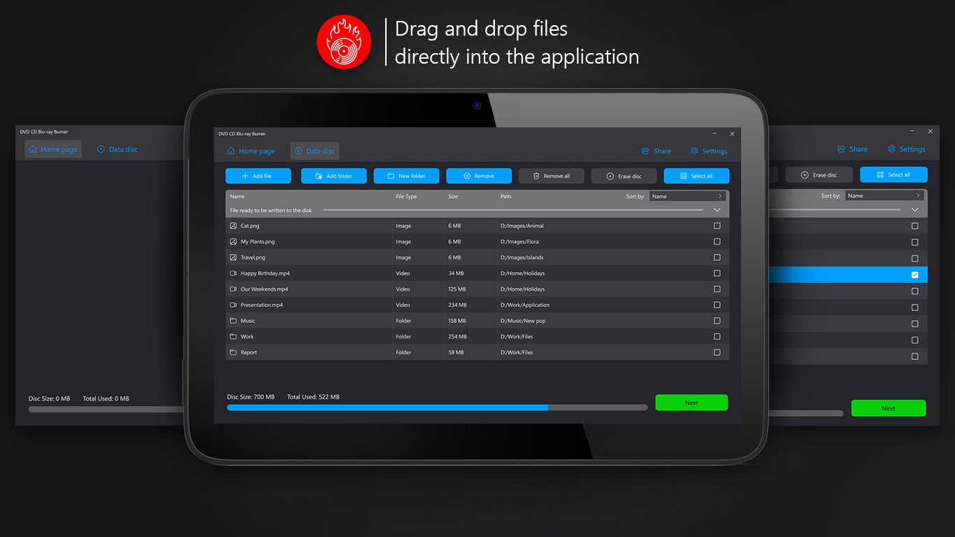Supported discs: CD-R, CD-RW, DVD-R, DVD-RW, Mini DVD-R, Mini DVD-RW, Blu-ray-R, Blu-ray-RW.For audio and video files burning MP3, MP4, WAV, WMA and lots of other formats may be usedA single file can be added as well as a folderDrag&Drop option allows to add the necessary files easilyMulti-language interface