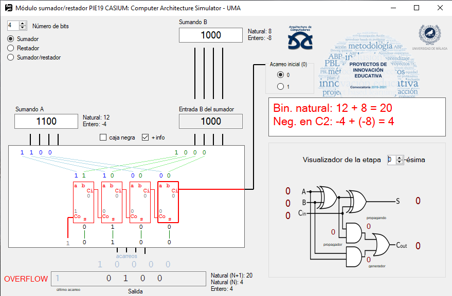 Simulator of a subtractor/adder (heart of the arithmetic-logical unit, ALU) of a computer.