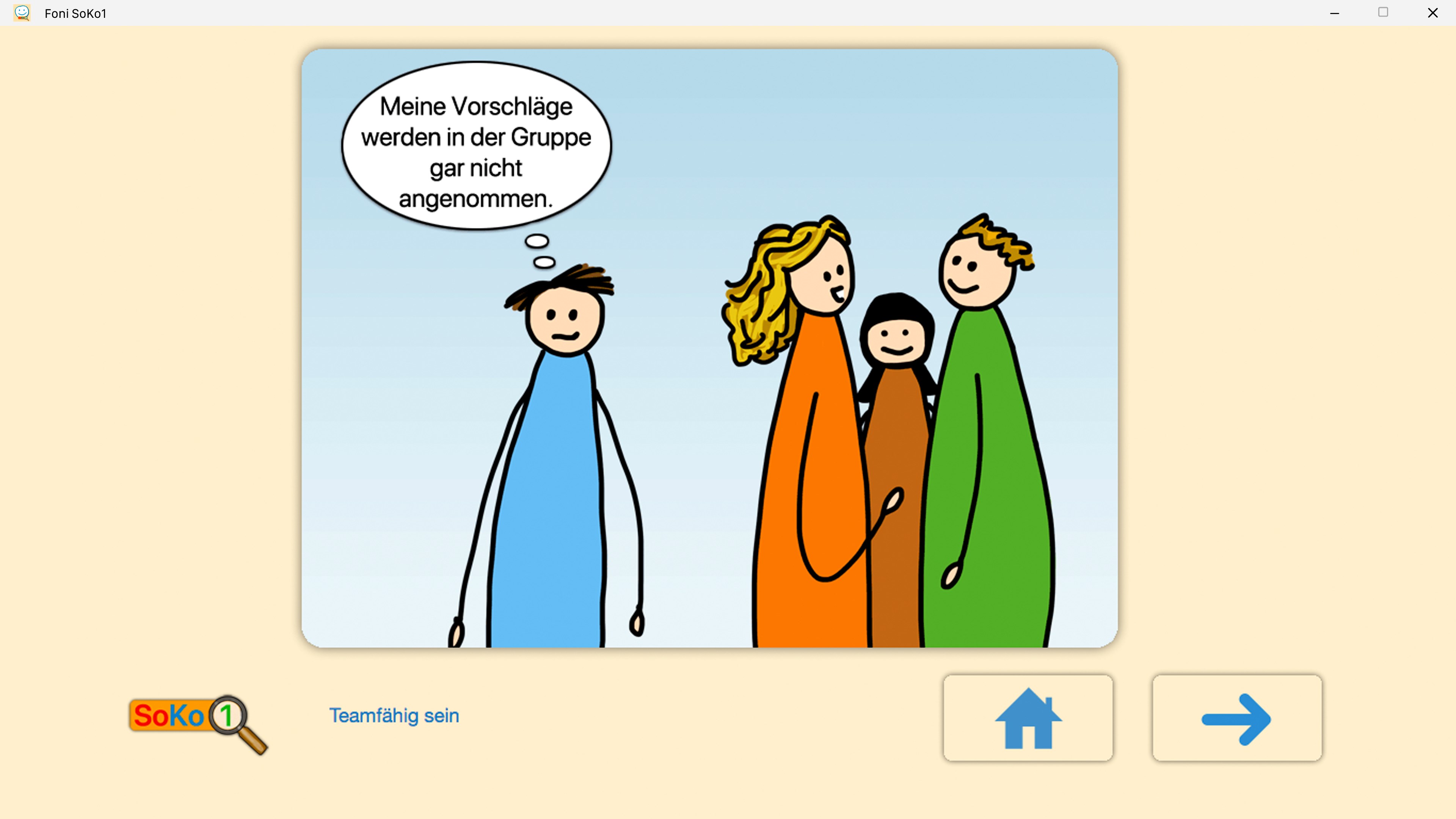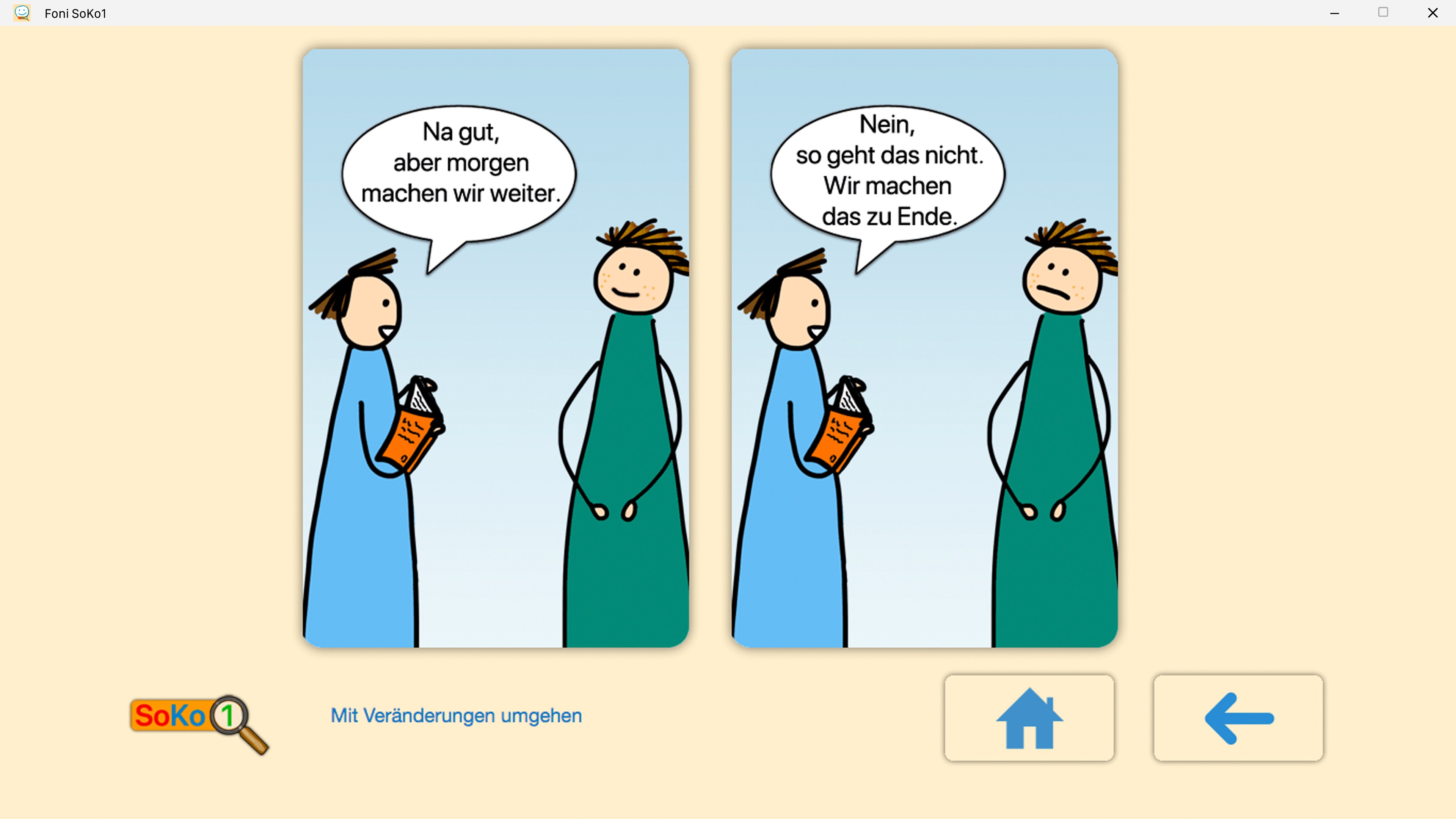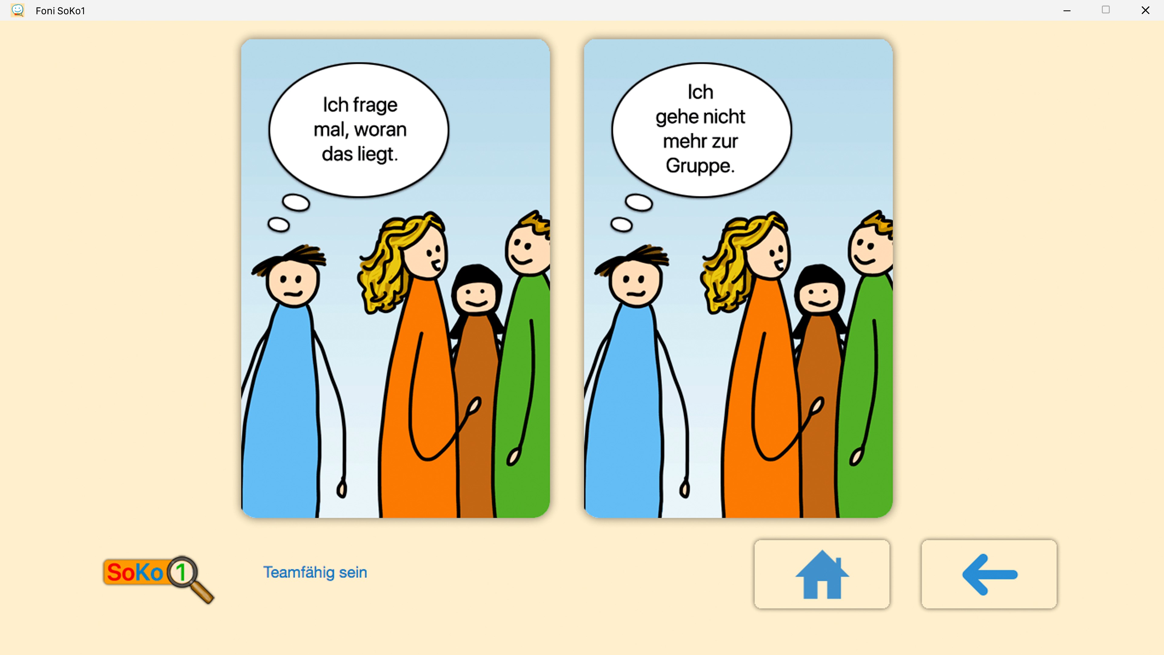 Das Training mit der Foni SoKo1 App sollte mit einer Fachkraft, einem Elternteil oder einem Coach erfolgen. Es werden zu einer Situation zwei Antwortmöglichkeiten aufgezeigt. Sobald eine Wahl getroffen wurde, erscheint die Frage „Warum hast Du Dich so entschieden?“. Dieses Hinterfragen kann zum Dialog anregen. Auch mögliche Missverständnisse können gleich geklärt werden, wenn zum Beispiel die Cartoon-Situation unterschiedlich gedeutet wird.