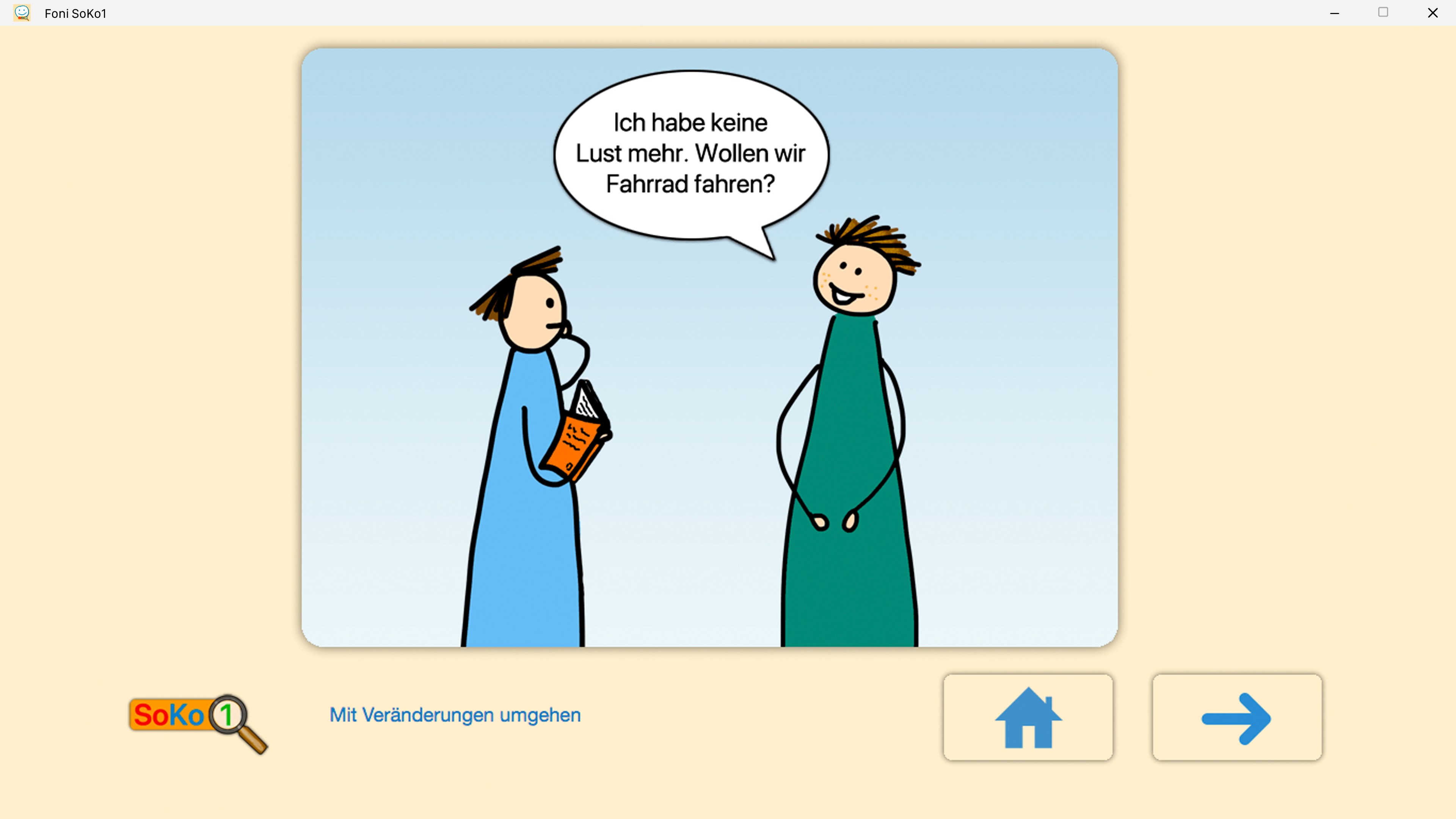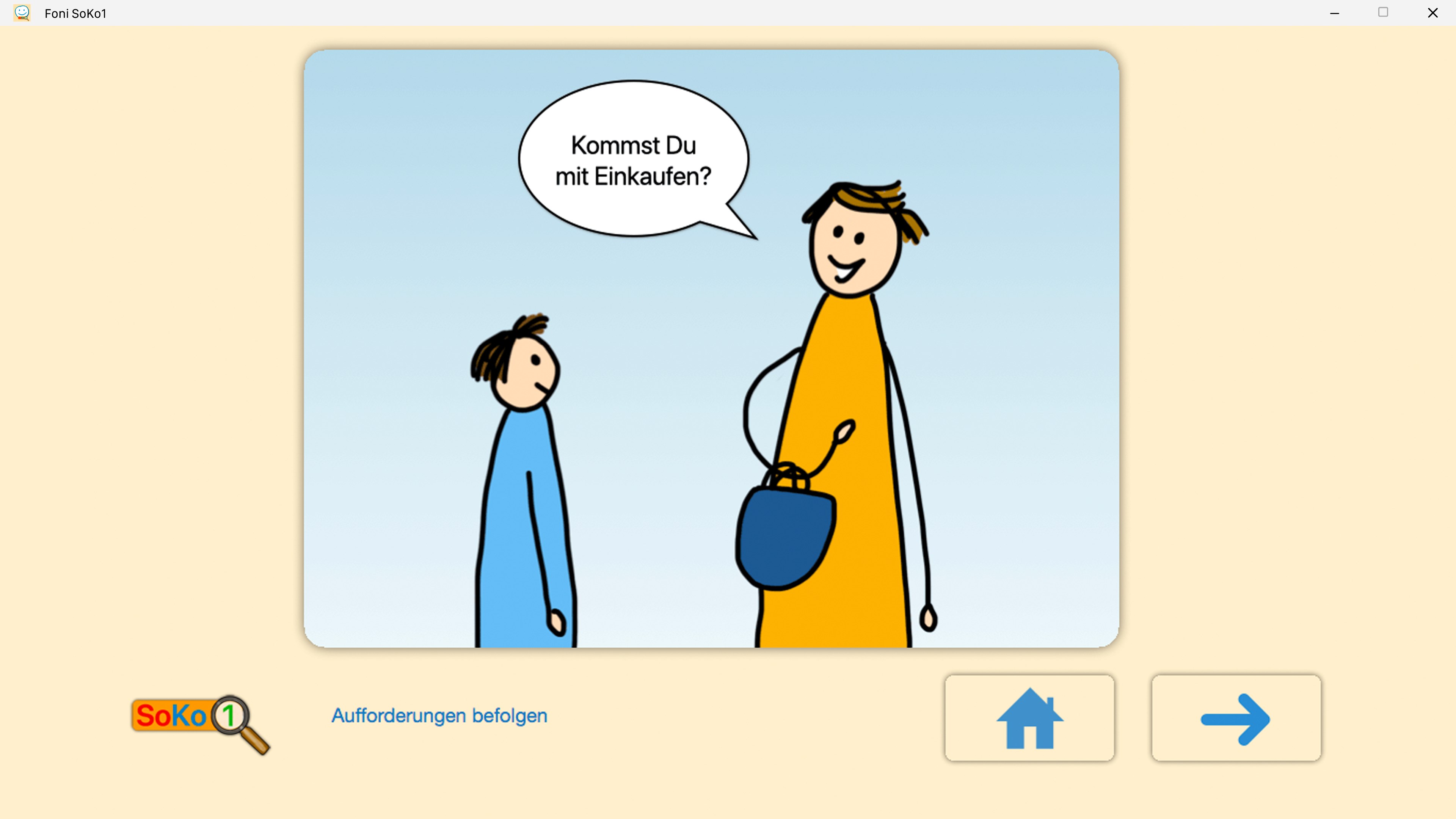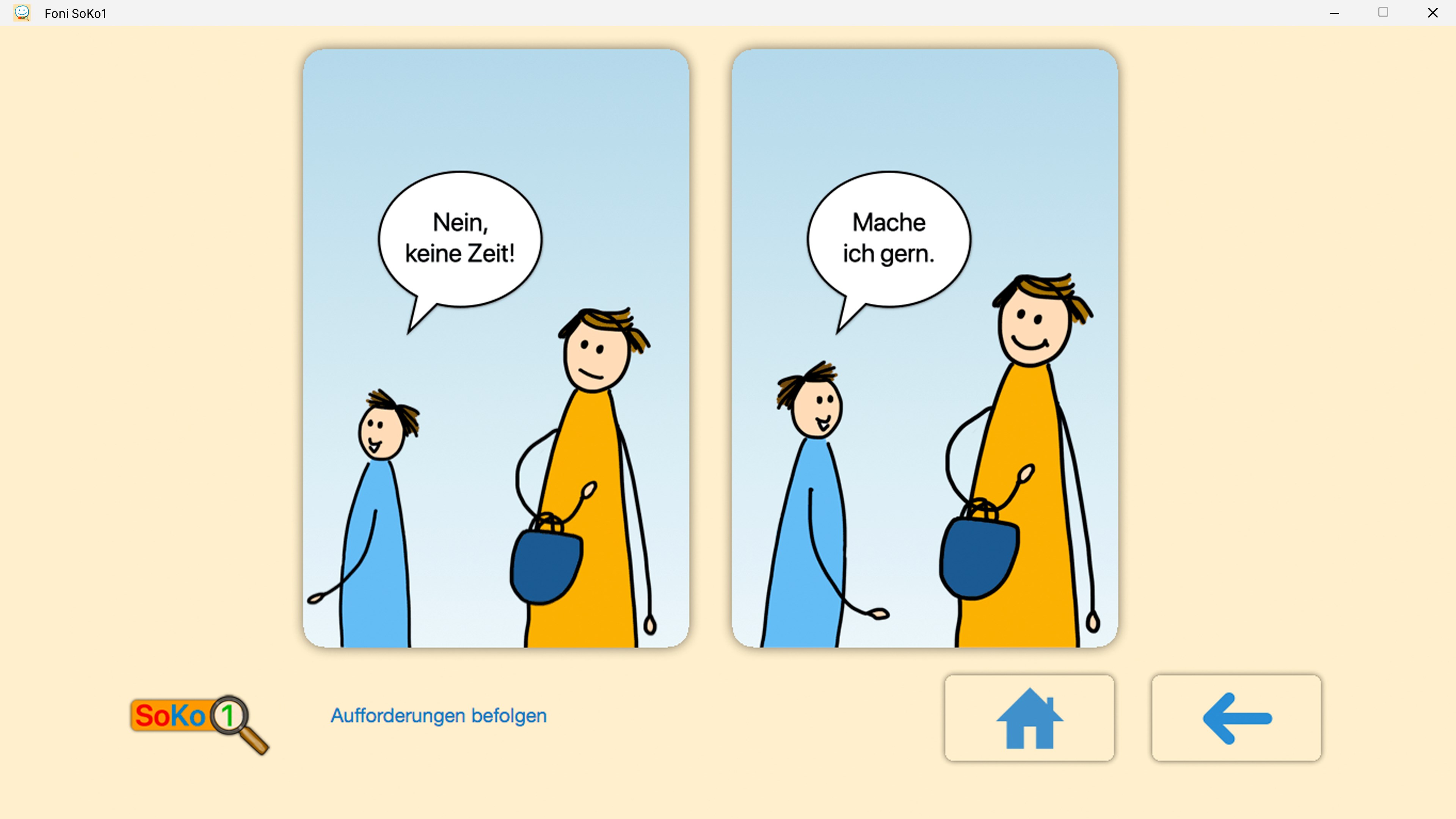 Das Training mit der Foni SoKo1 App sollte mit einer Fachkraft, einem Elternteil oder einem Coach erfolgen. Es werden zu einer Situation zwei Antwortmöglichkeiten aufgezeigt. Sobald eine Wahl getroffen wurde, erscheint die Frage „Warum hast Du Dich so entschieden?“. Dieses Hinterfragen kann zum Dialog anregen. Auch mögliche Missverständnisse können gleich geklärt werden, wenn zum Beispiel die Cartoon-Situation unterschiedlich gedeutet wird.