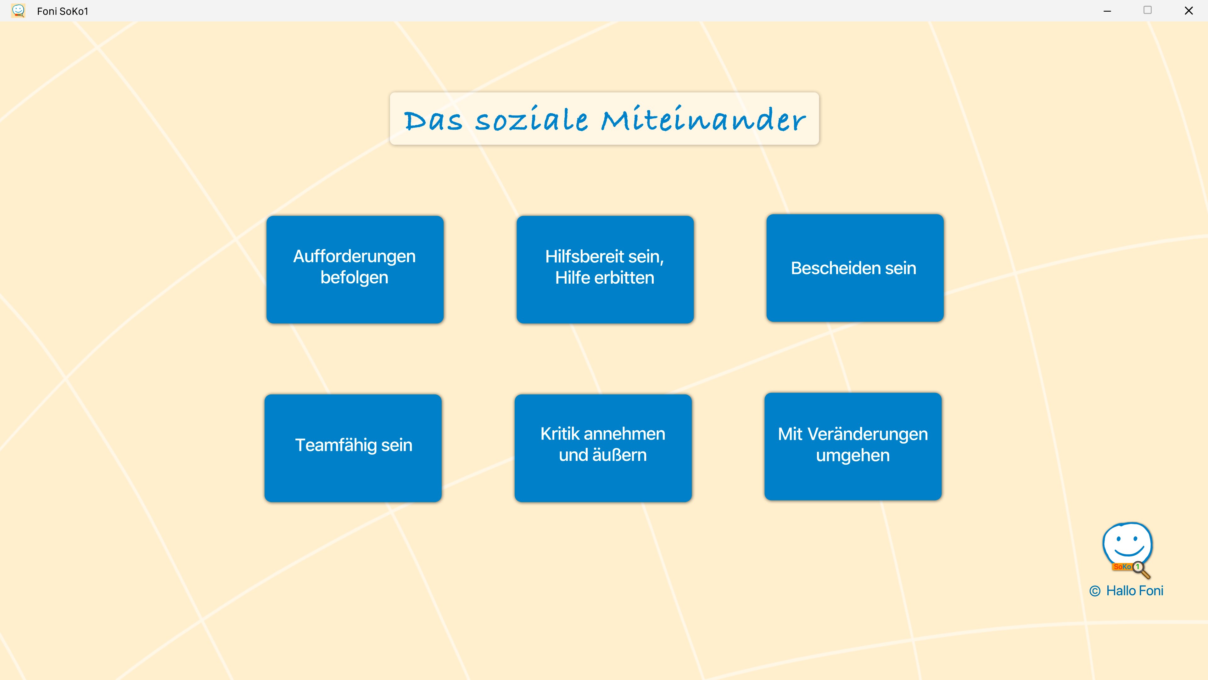Foni SoKo1 - „Das soziale Miteinander\“Aufforderungen befolgenHilfsbereit sein, Hilfe erbittenBescheiden seinTeamfähig seinKritik annehmen und äußernMit Veränderungen umgehen