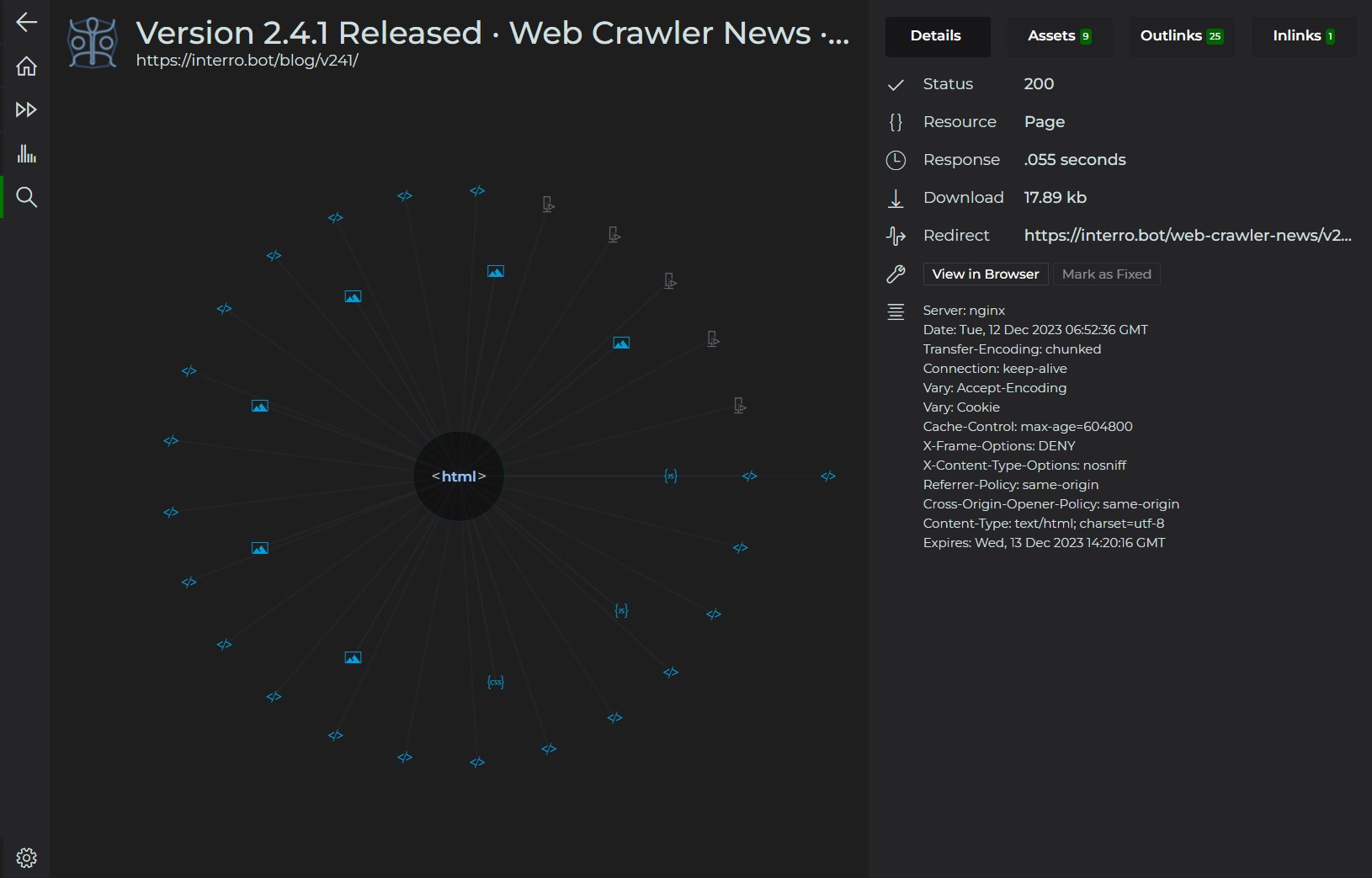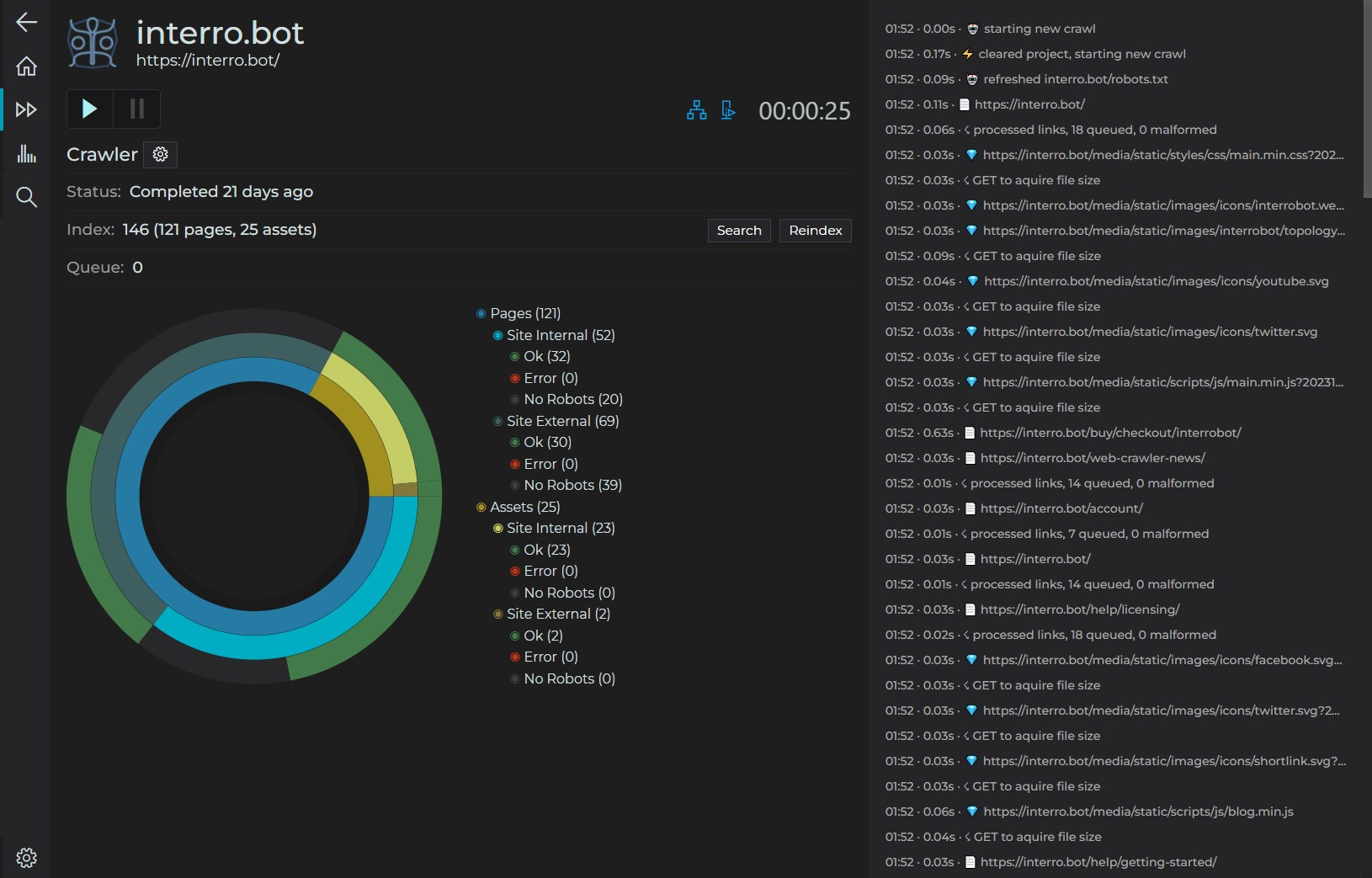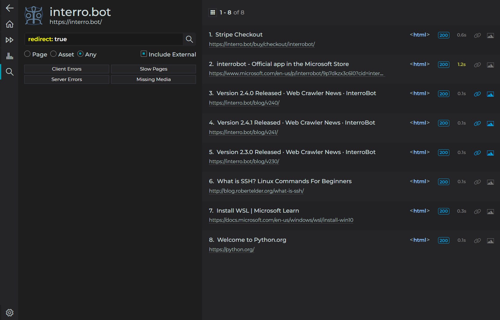 Need to find specific content across your pages? Hunt down broken links? Analyze keyword usage patterns? Or dive deep into HTTP headers and status codes? InterroBot has you covered with powerful search and visualization tools.