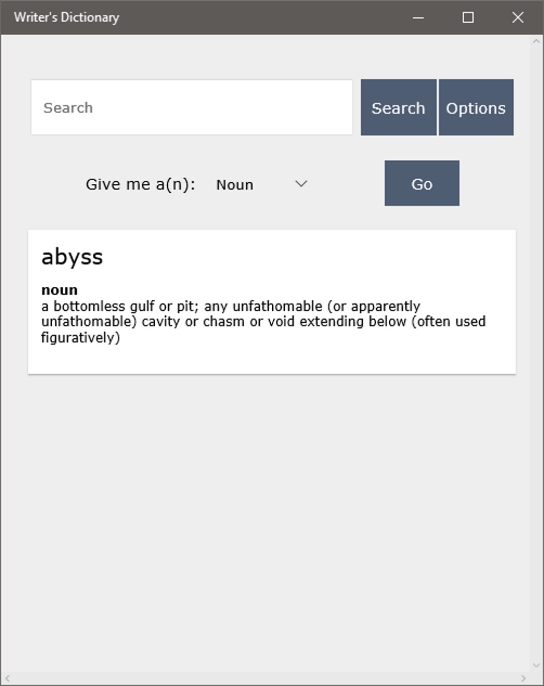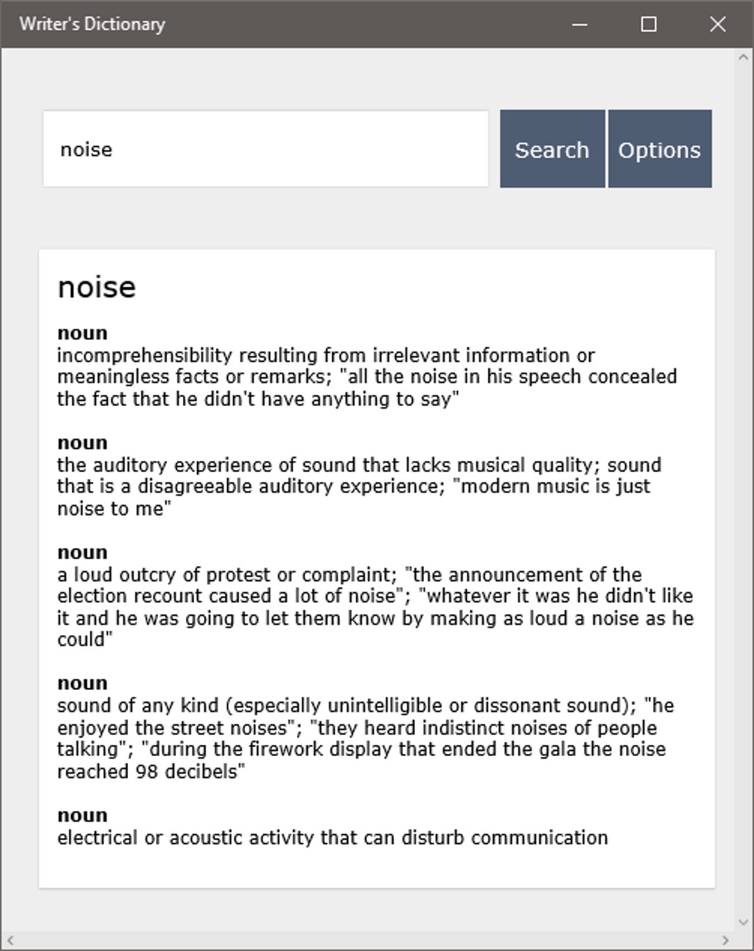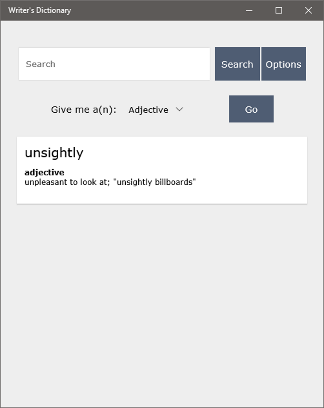 An offline dictionary for writers. Search for a word in our database with over 100,000 entries, or use our random feature to generate adjectives, adverbs, nouns and verbs to help with your writing!