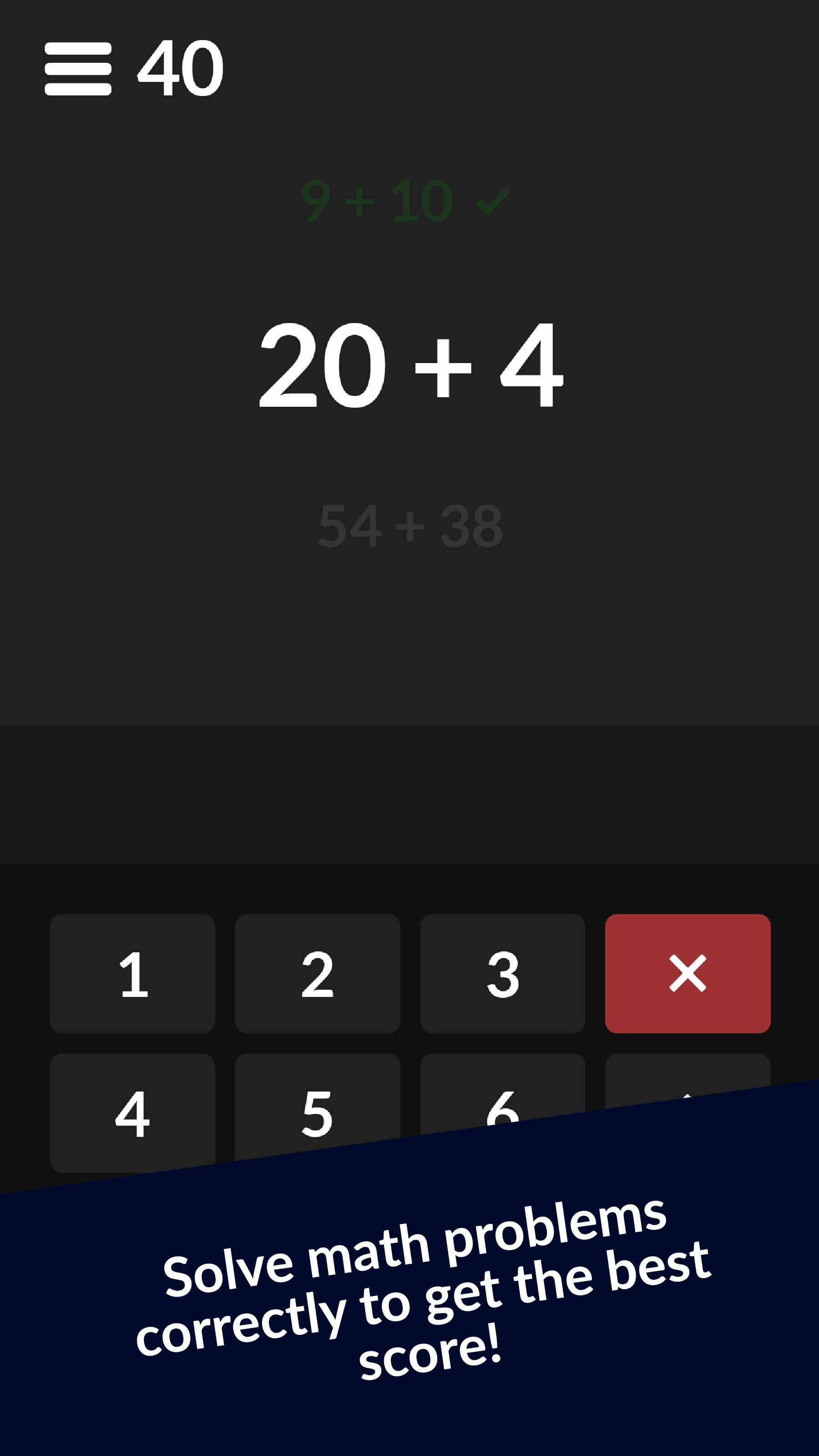 A standard game will generate 50 questions for you to solve. Solving questions correctly will increase the difficulty of the game and generate harder questions, while incorrect answers lower the difficulty. Correct answers will automatically be accepted by the game, while incorrect answers (if the question is too difficult) will be accepted after a short delay. After all 50 questions have been answered, you will be presented with your score.