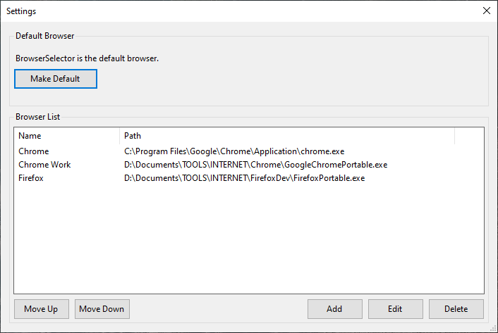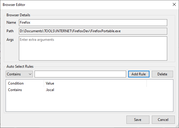Select you preffered browsersProvide custom url parameters for the specific browserAllows to enter simple rules to automatically select the browser depending on the url stringExport/Import app configuration