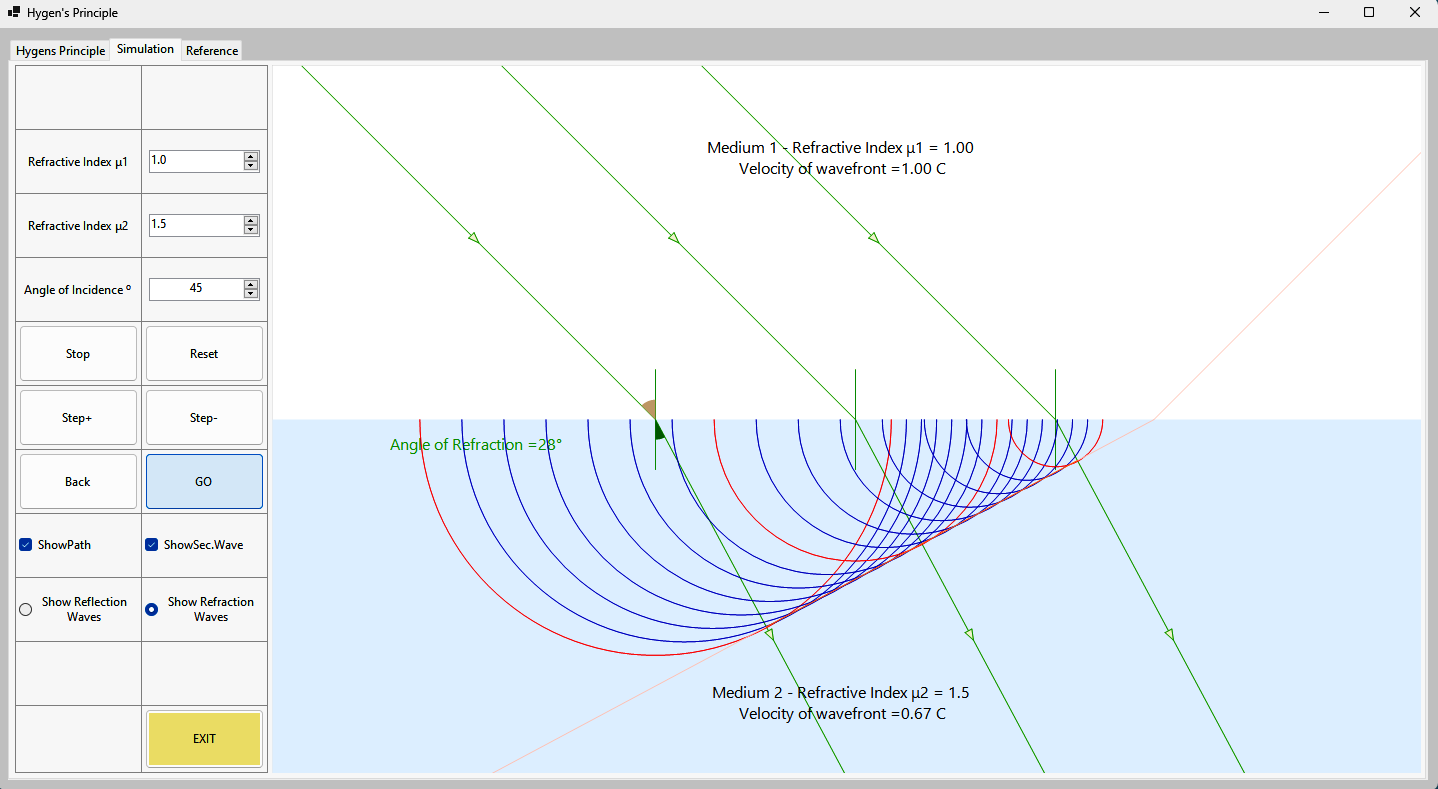Huygens’ principle is a statement that all points of a wavefront of sound in a transmitting medium or of light in a vacuum or transparent medium may be regarded as new sources of wavelets that expand in every direction at a rate depending on their velocities. Proposed by the Dutch mathematician, physicist, and astronomer Christiaan Huygens in 1690, it is a powerful method for studying various optical phenomena. An excellent tool for visualization of Huygen’s principle.