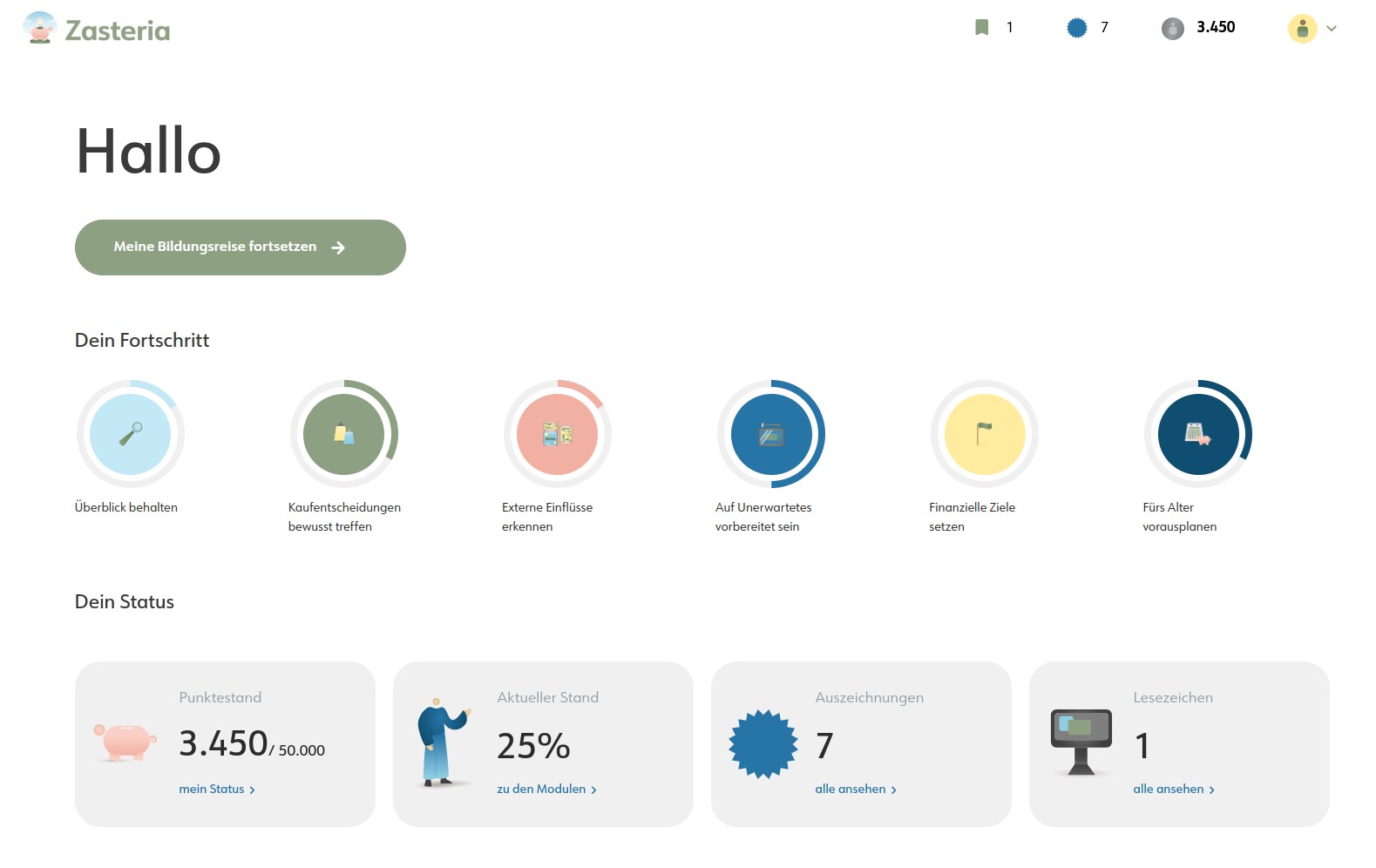 Die Zasteria ist eine Web-App, die Menschen in ihrer aktuellen Lebensrealität abholt und ihnen die relevanten Fertigkeiten für einen guten Umgang mit Geld vermittelt.