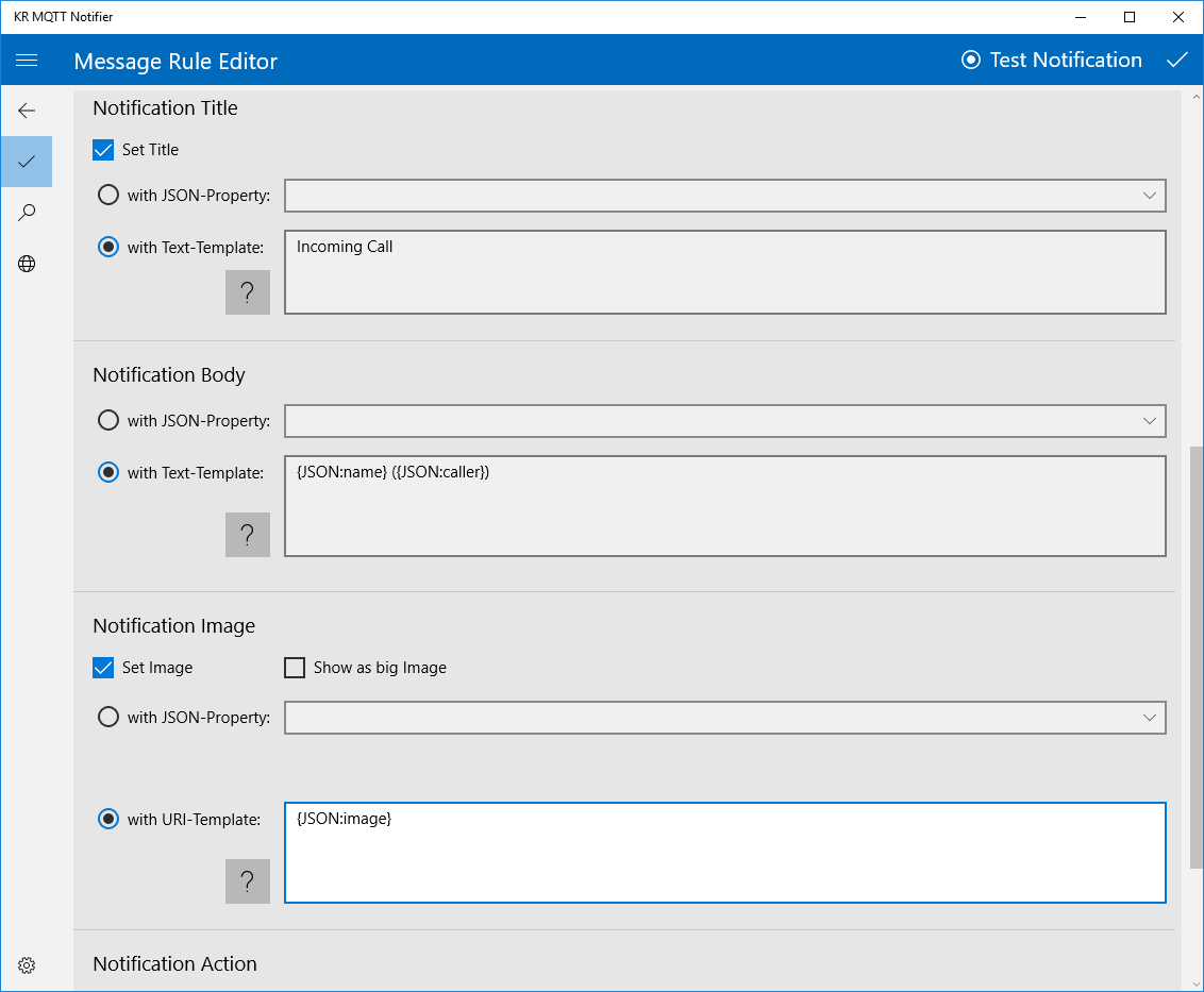 With Text-Templates you have the ability to insert environment and content variables of MQTT-Notifications,