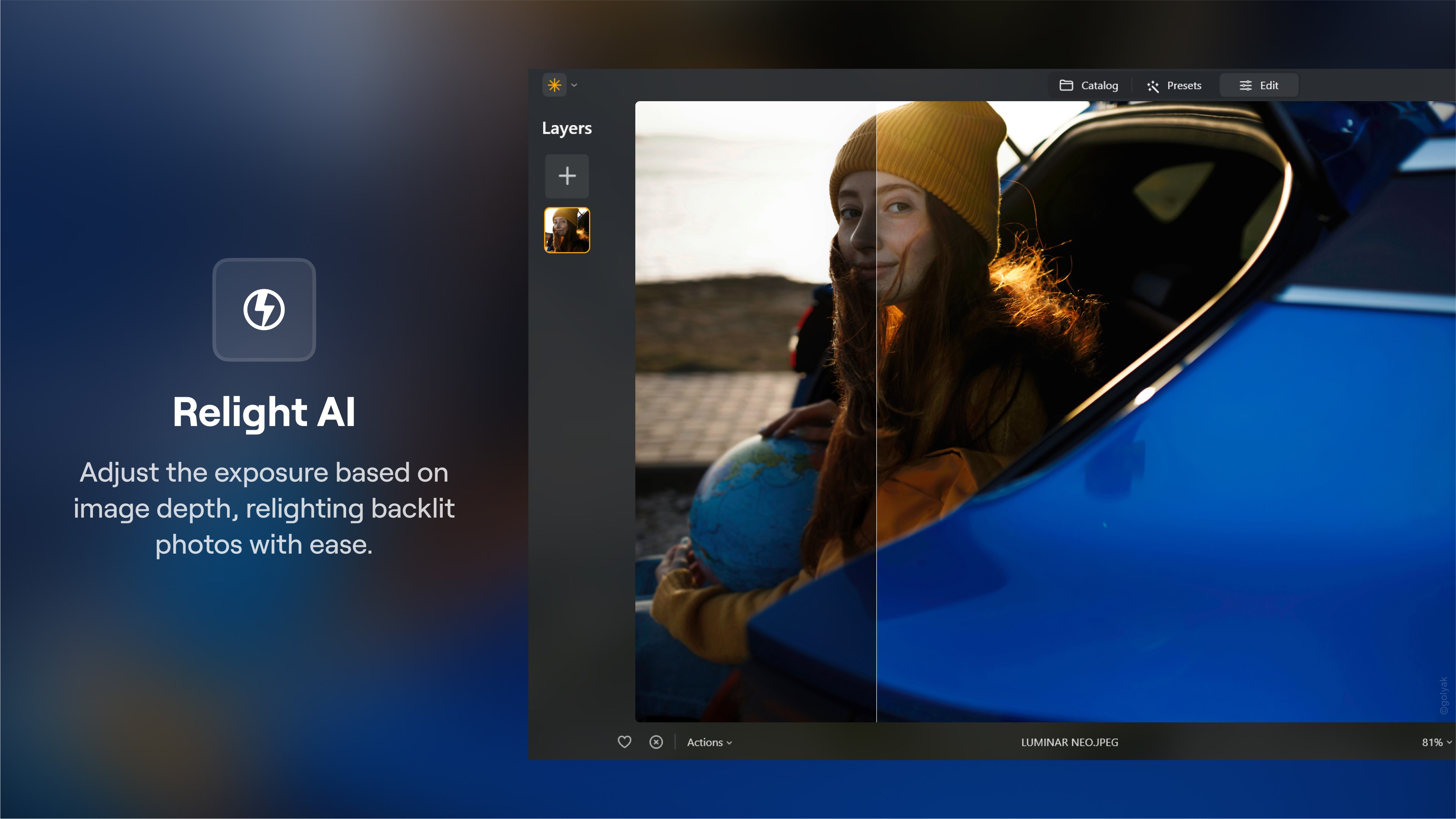 GenErase: Eliminate distractions and seamlessly fill gaps with AI-generated elements that match the surrounding areaGenExpand: Extend the boundaries of your photos and fill the new space with realistic AI-generated visualsGenSwap: Replace specific elements in your photos with AI-generated visuals that seamlessly integrate with the rest of your imageSky AI: Automatic sky replacement — make dull, cloudy days look brilliantAtmosphere AI: Realistically simulate weather effects like fog, mist, and haze using advanced 3D depth reconstructionSunrays: Emulate the natural illumination and effects of sunlightTwilight Enhancer AI: Emulate the ambiance of the blue and golden hours around sunrise and sunsetWater Enhancer AI: Adjust and refined the color, depth and reflective quality of any body of waterSkin AI: Automatically detect and remove skin imperfections while preserving texture and detailFace AI: Retouch facial features with precisionBody AI: Adjust body proportions by removing or adding volume to a subject\’s midsection to achieve the desired lookStudio Light: Replicate studio lighting effects with a photo brightener, typically achieved with expensive studio equipmentPortrait Bokeh AI: Create bokeh effects in portrait photos based on image depth reconstructionNeon & Glow: Add captivating lighting effects and blend neon elements for added visual appeal Supercontrast: Precisely adjust tonal contrast in different ranges to enhance image depth and detailEnhance AI: With one slider, automatically adjust up to a dozen elements including shadows, highlights, contrast, tone, saturation, and exposureRelight AI: Emulate a 3D light source (flash) to dynamically adjust lighting conditionsNoiseless AI: Advanced noise reduction that keeps details intactSupersharp AI: Unblur photos and enhance details with this image sharpening tool Upscale: This photo resizer allows you to increase resolution up to 6XColor Transfer: Transfer the colors from any reference image to your photo, mimicking palettes and styles with ease.