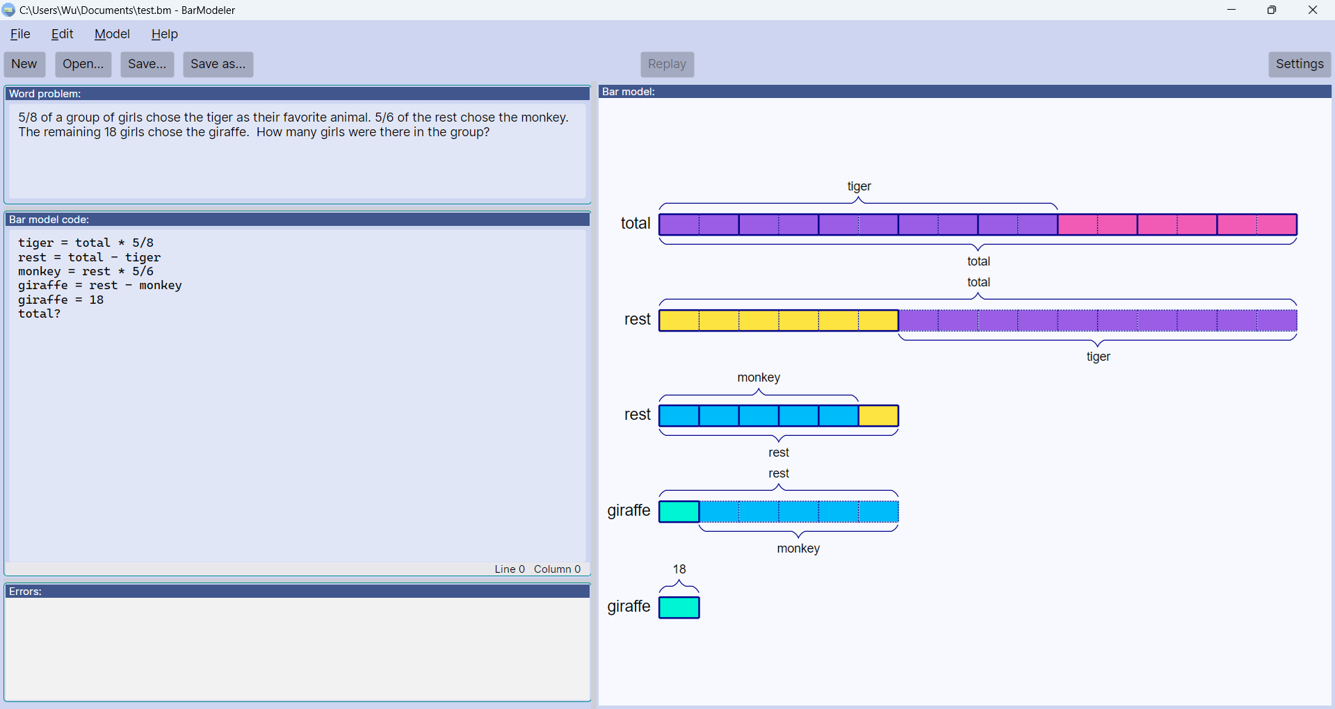 BarModeler is a tool for primary school students and their teachers and/or parents to "draw" bar models in Math by writing code (equations). While the user describes his/her understanding about a word problem by writing equations, the tool can automatically create a bar model to visualize the equations, which will help the user to understand the word problem both abstractly and visually.