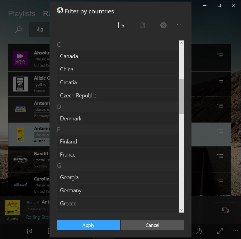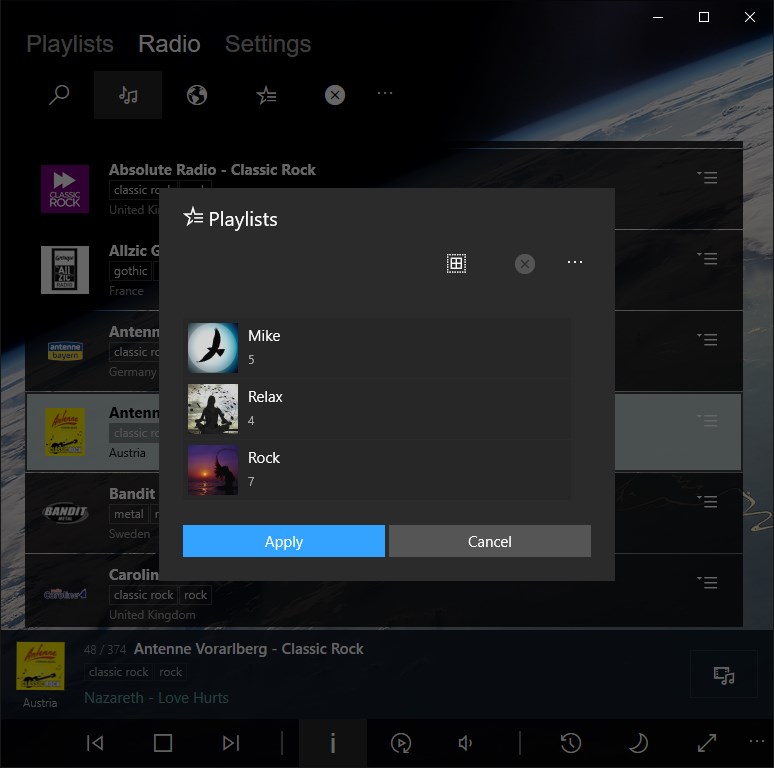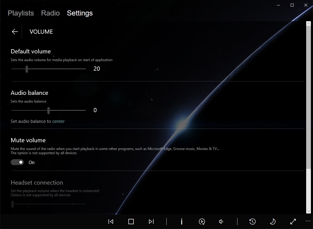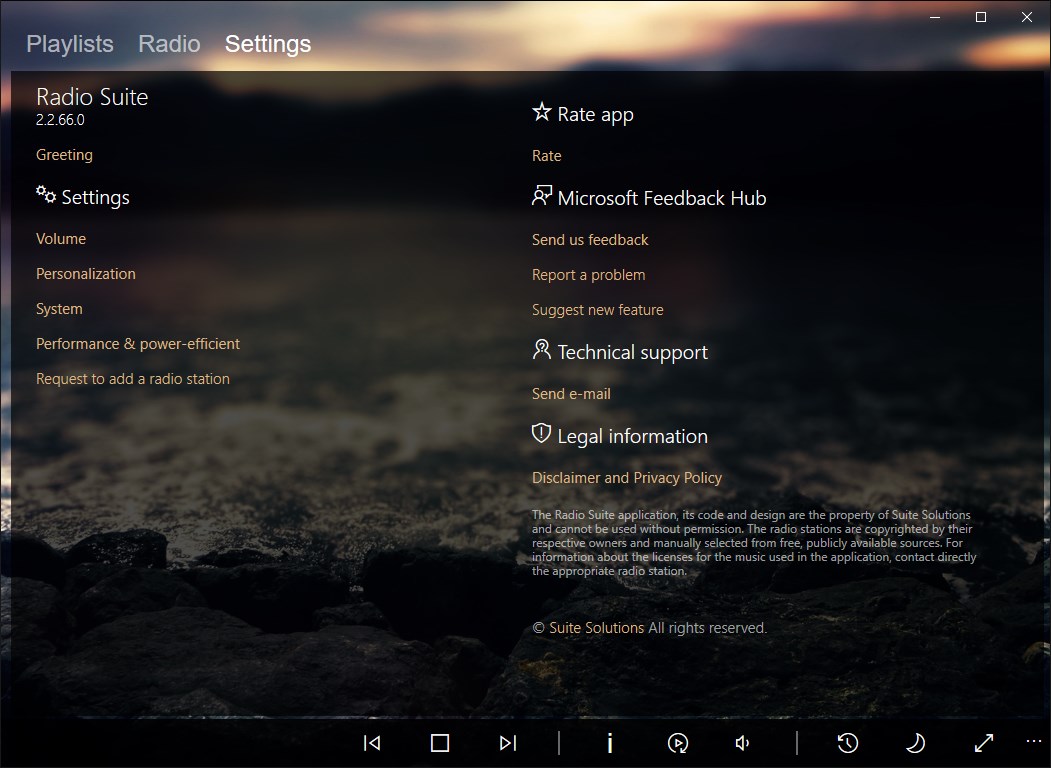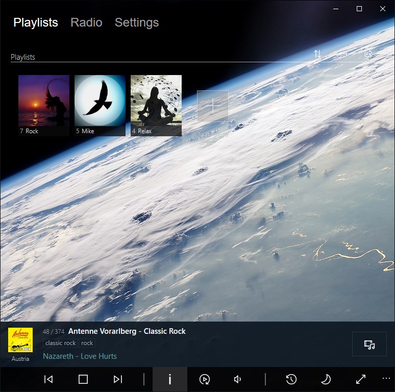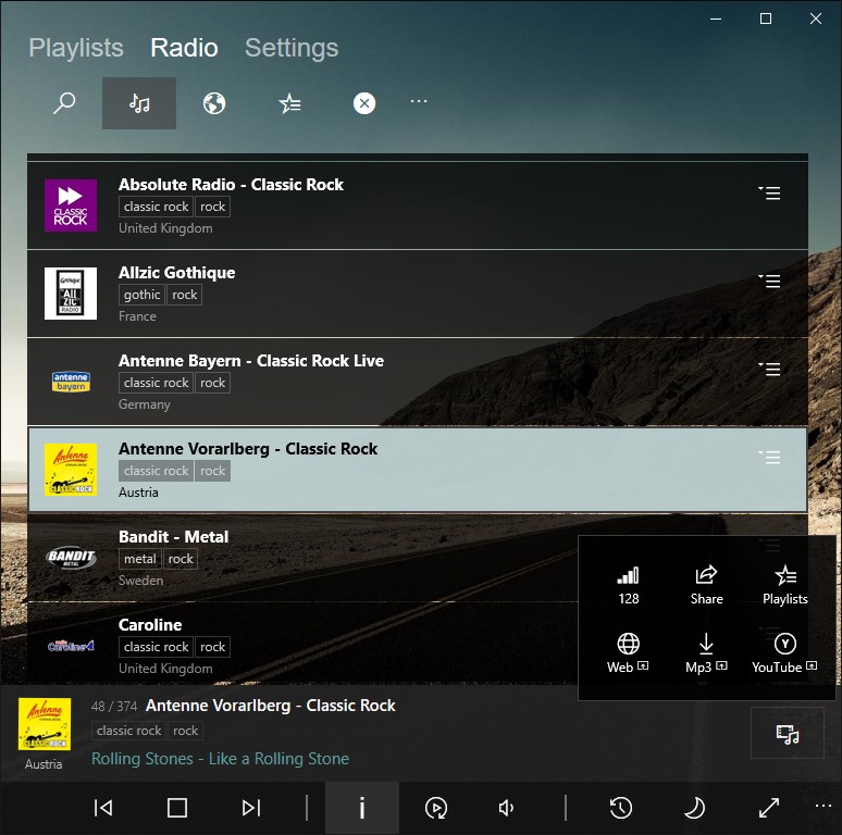 Searching by few filters simultaneously (by genre, country and title)More than 50 countriesMore than 150 genres, divided into categories for the convenience of choosing radio stations by the moodSupport for playlists with the ability to search the radio stations in themChanging the bitrate (for radio stations that broadcast streams in several bitrates)Display of information "Artist and Title of the song" (for radio stations that broadcast information) with the ability "to share" with friendsSearching for songs in MP3 (for radio stations that broadcast information)Viewing music videos of songs on YouTube (for radio stations that broadcast information)Listening history with the ability to search for MP3 and view on YouTubeLink to the website of the radio stationShare playlists with friends import/export playlistsPossibility to pin tile of playlists on startThe mode of preliminary listening to radio stations (15 second playback of the radio stations in the list)Sleep mode (automatically turn off the radio station playback according to the set time)A lot of settings, among which: - setting the volume at startup; - stereo balance; - mute the sound when you start playback in other programs; - power save mode; - visual themes...Compact mode