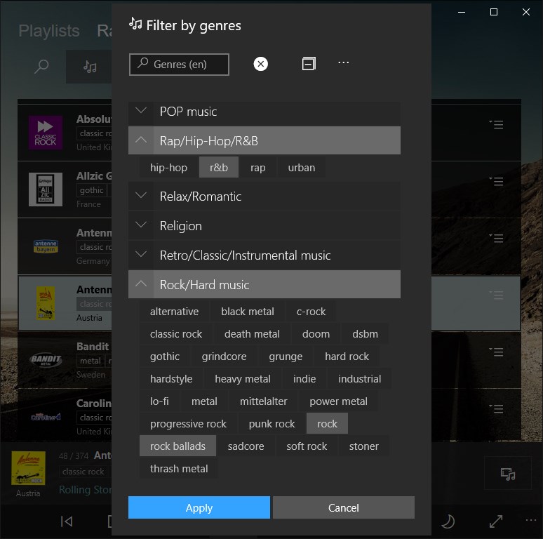 • More than 150 genres, divided into categories for the convenience of choosing radio stations by the mood
