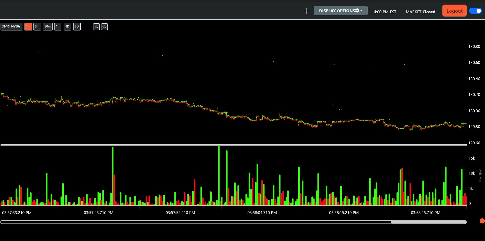 The flood of data that Tephra receives is loaded on charts throughout the day, consistent with the US pre and post market times. Tephra presents a 3 day historical view of data received from partner exchanges.