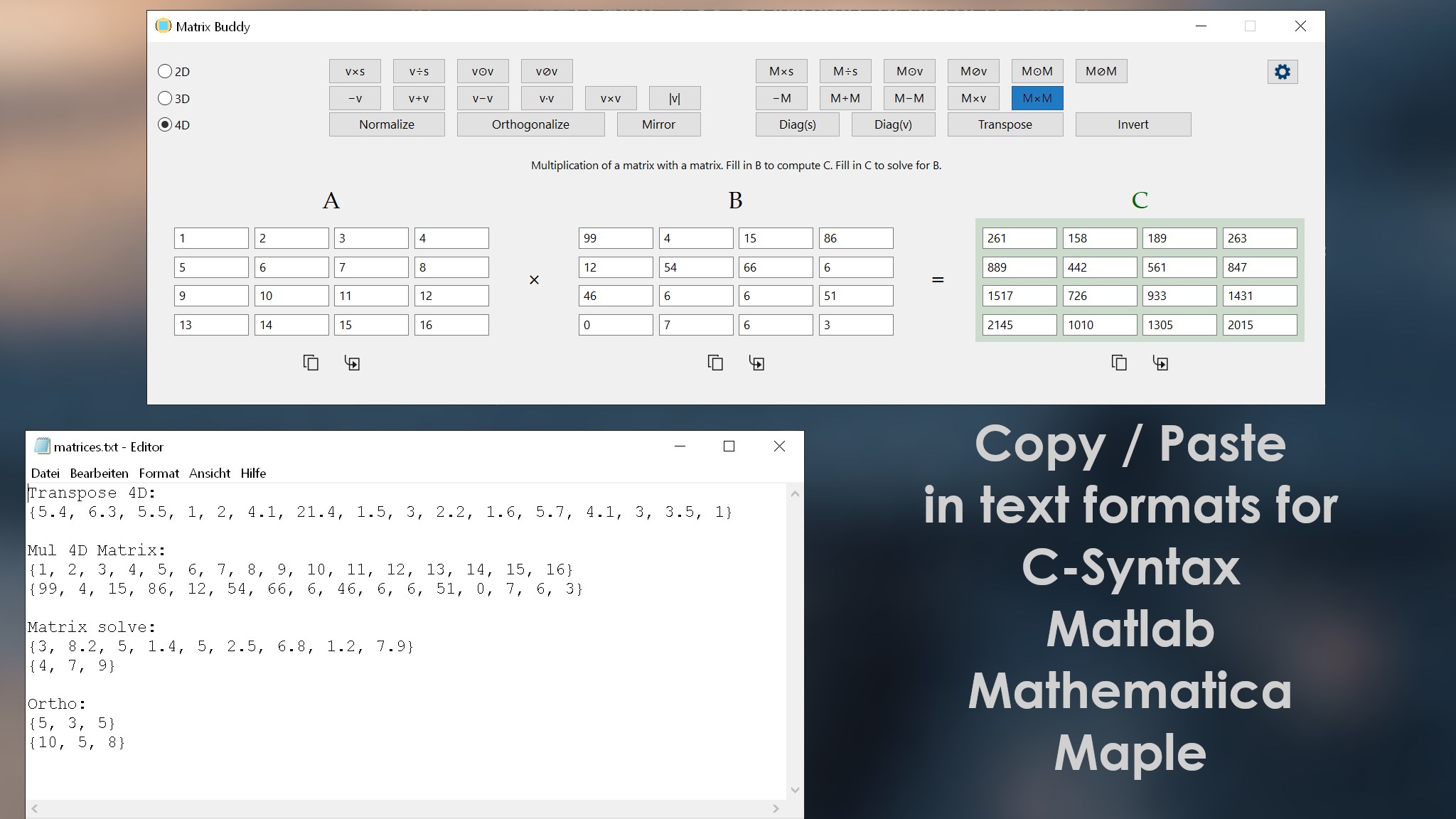 With an intuitive interface, Matrix Buddy offers a seamless experience for both students and developers. Easily perform calculations, and copy and paste serialized vectors and matrices in a variety of formats, including C-style, Mathematica, Matlab, and Maple.