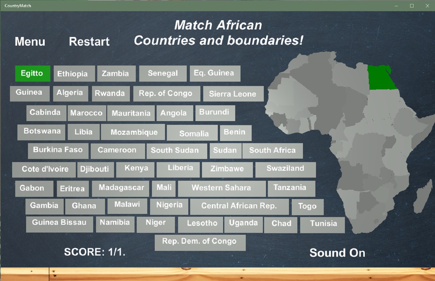 CountryMatchAfrica is an educational game that will test your geography skills. You will have to associate each country with its position in the map of Africa . First you have to click on the name of the country and then on the position on the map. If the match is right you gain a point. If it is wrong you gain an error. When you have clear the stage, you can see your score and the teacher comment.