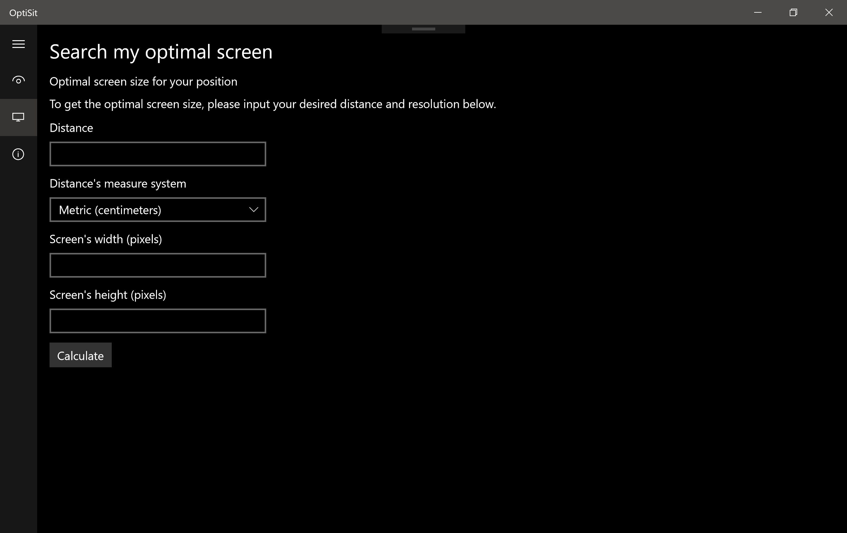 OptiSit™ is a lightweight, multiplatform calculator of the optimal distance between your eyes and your screen.