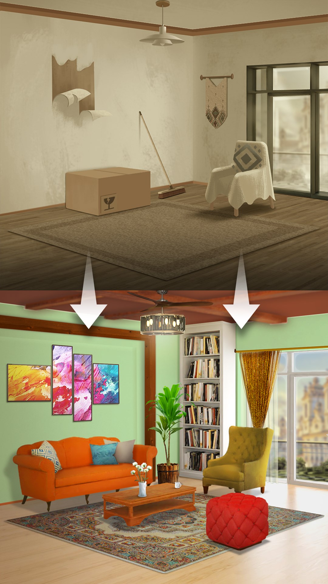 Decorate desired house interior by breaking through stages.