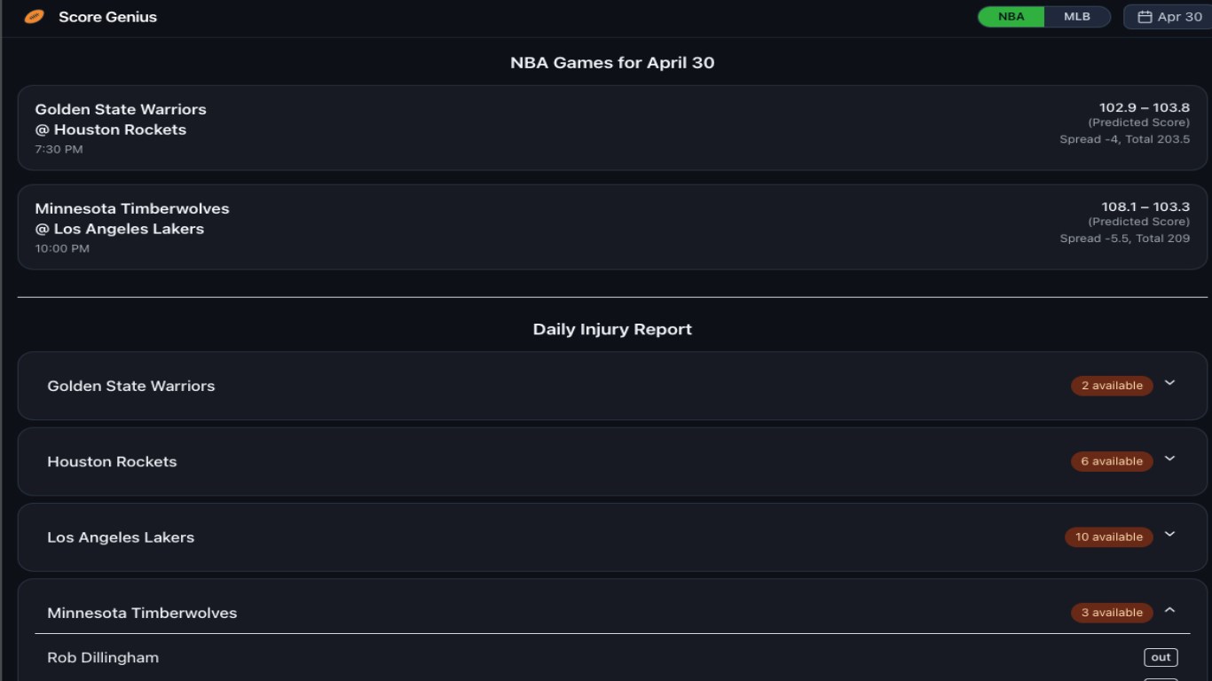 Bring the power of real-time predictive analytics and AI-driven insights for NBA (and soon MLB & NFL) right to your Windows desktop or tablet. ScoreGenius leverages advanced machine learning, live odds data, and natural language generation to help you: