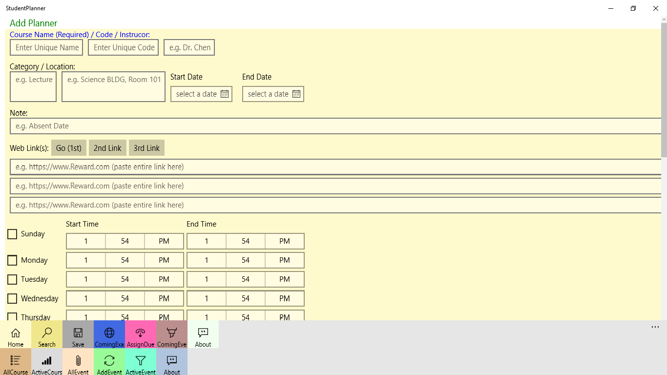 Create your own Reminder(s), track your courses, exam, assignment and events, few build in Student Planner Cortana voice commands including Coming Exam, Coming Event, Assignment Due, Active Course and Active Event to show you the list. You will also get toast notification or live tile for how many items in the list. Supporting Window 10 Universal Windows Platform (UWP).