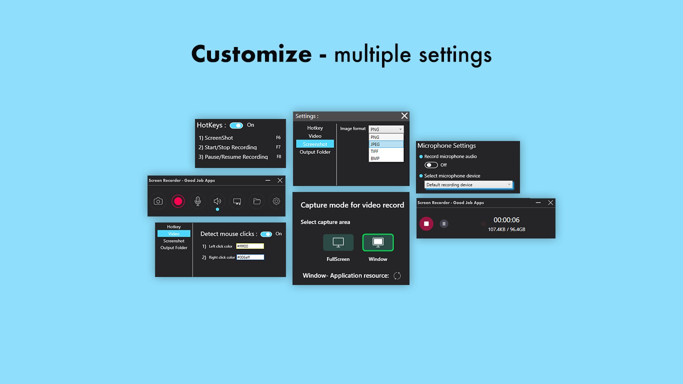 Perfect app to record and capture the screen in video formats. Screen recording of any app can be done in live application usage mode, like typing any message, record video calls, viewing any video or listening to any audio or anything available on the windows screen can be recorded.