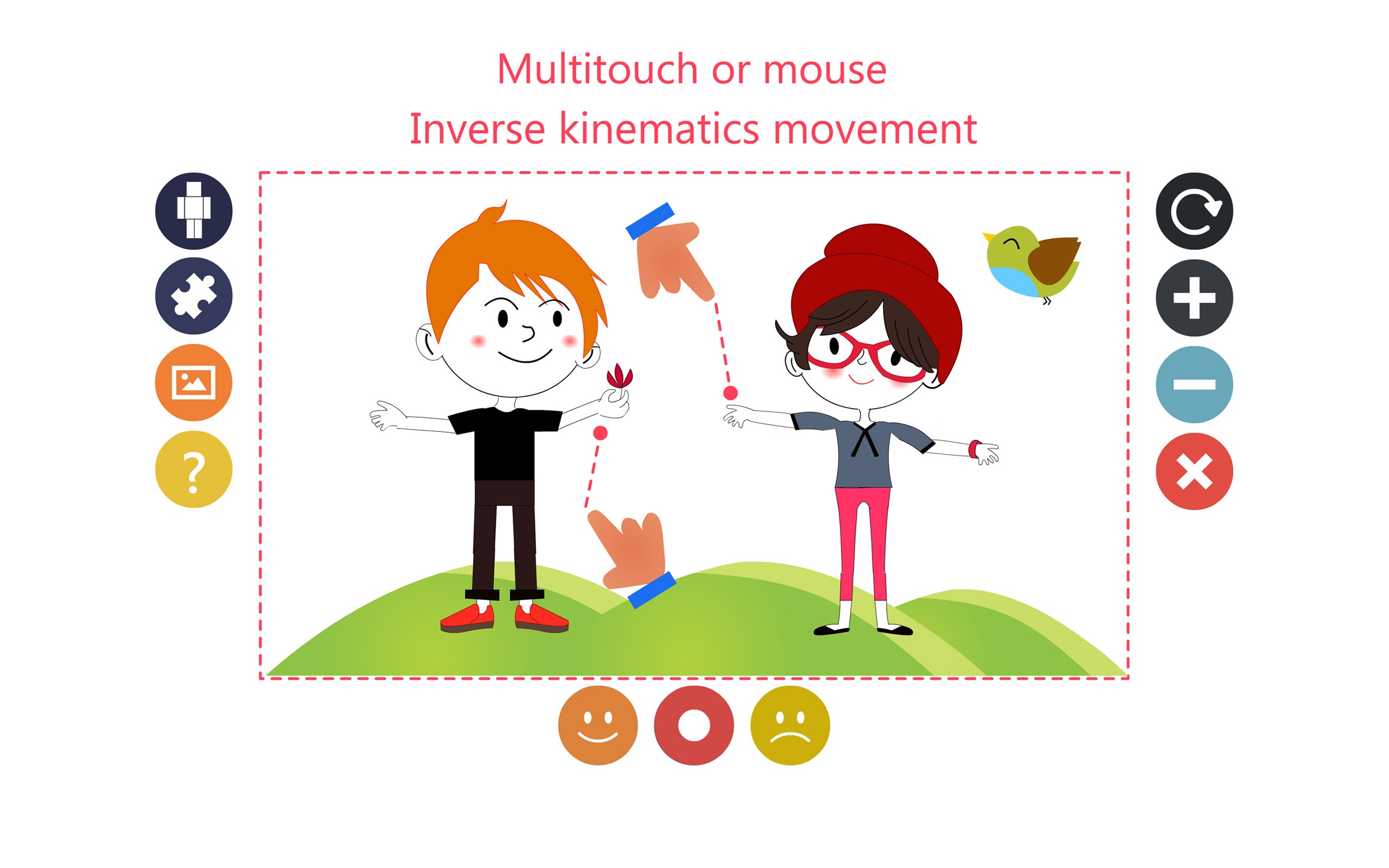 • Inverse kinematics movement.• Support multi touch and mouse.• 14 characters boys and girls with tons of customization.• Instantly record, save and replay.• Simple interface.• Appealing graphics and many beautiful things..