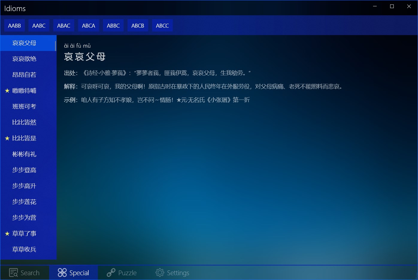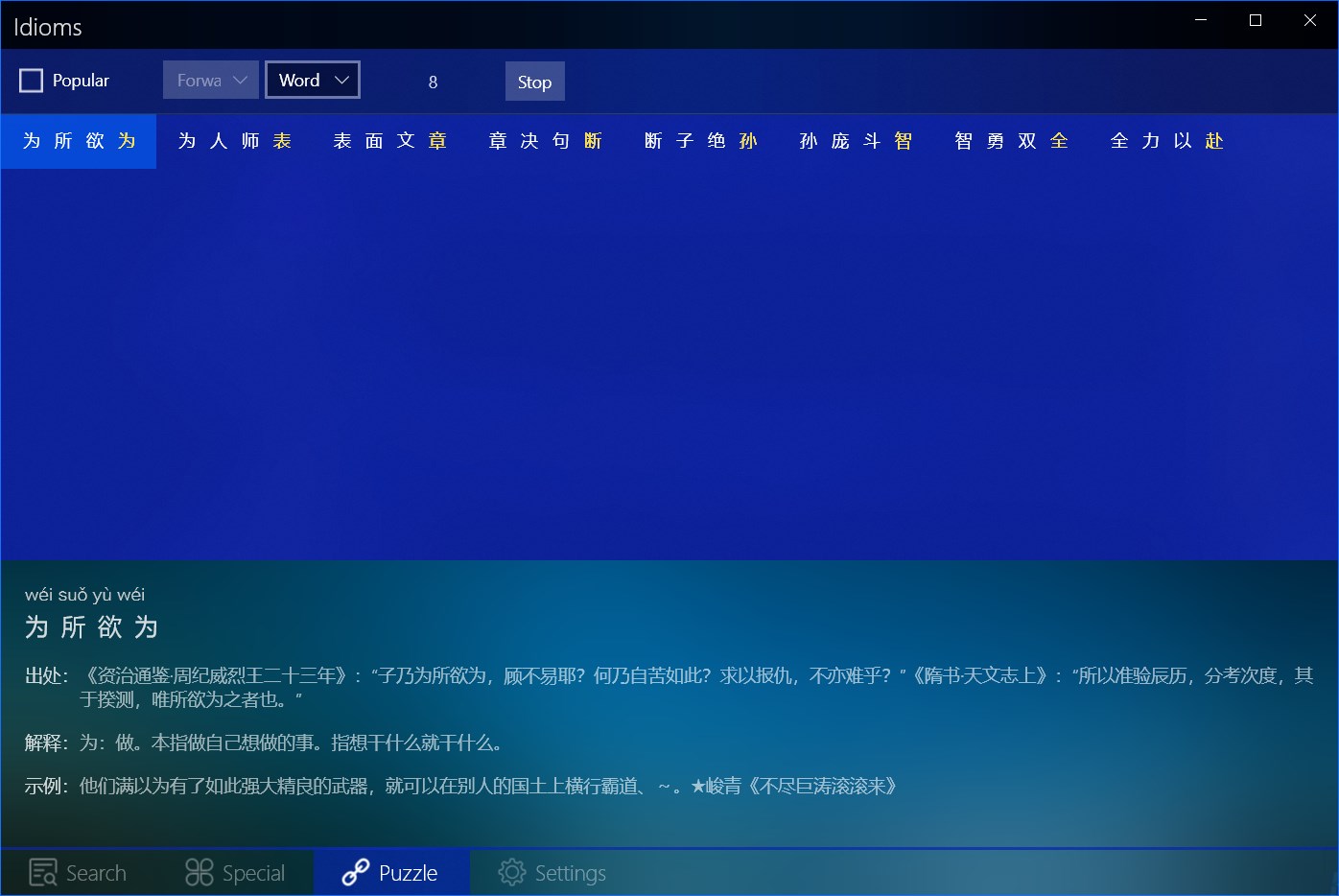 The app contains more than 30,000 idioms, of which nearly 4,000 are marked as popular idioms. Idiom information includes pinyin, origin, idiom puzzle, example, and so on. The app supports text fuzzy retrieval, special type query, idiom solitaire.